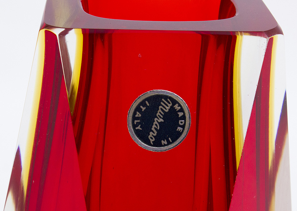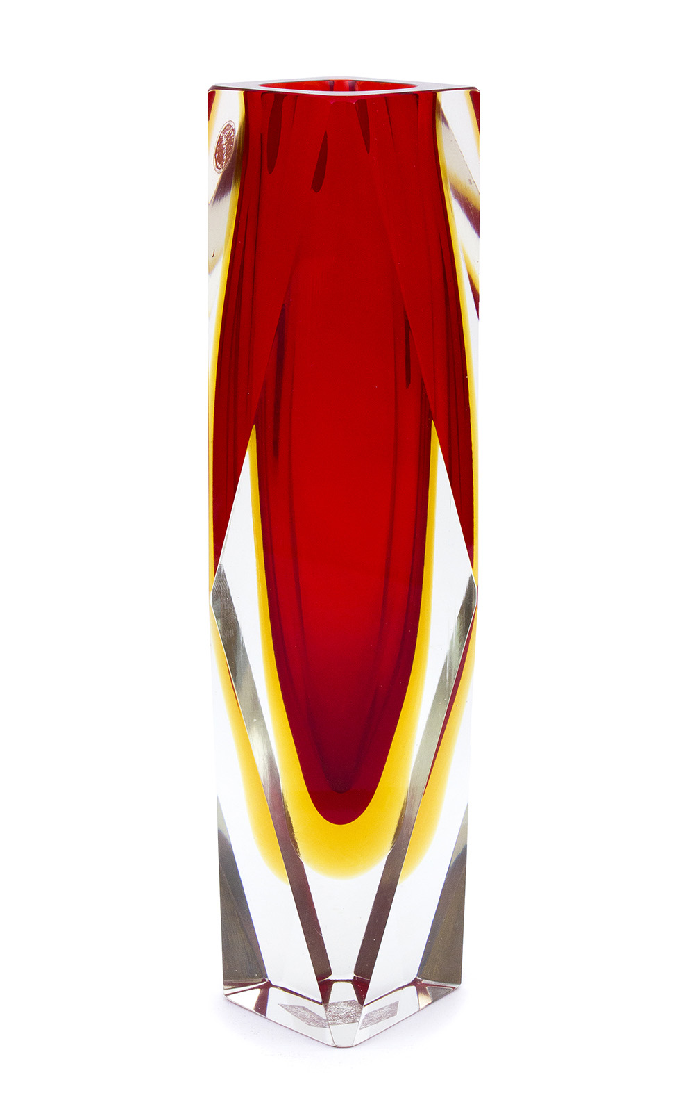 MANDRUZZATO - MURANO Vaso sfaccettato rosso e giallo, 1960 circa Vetro sommerso, h. 30 cm Etichetta sul lato: Murano made in Italy