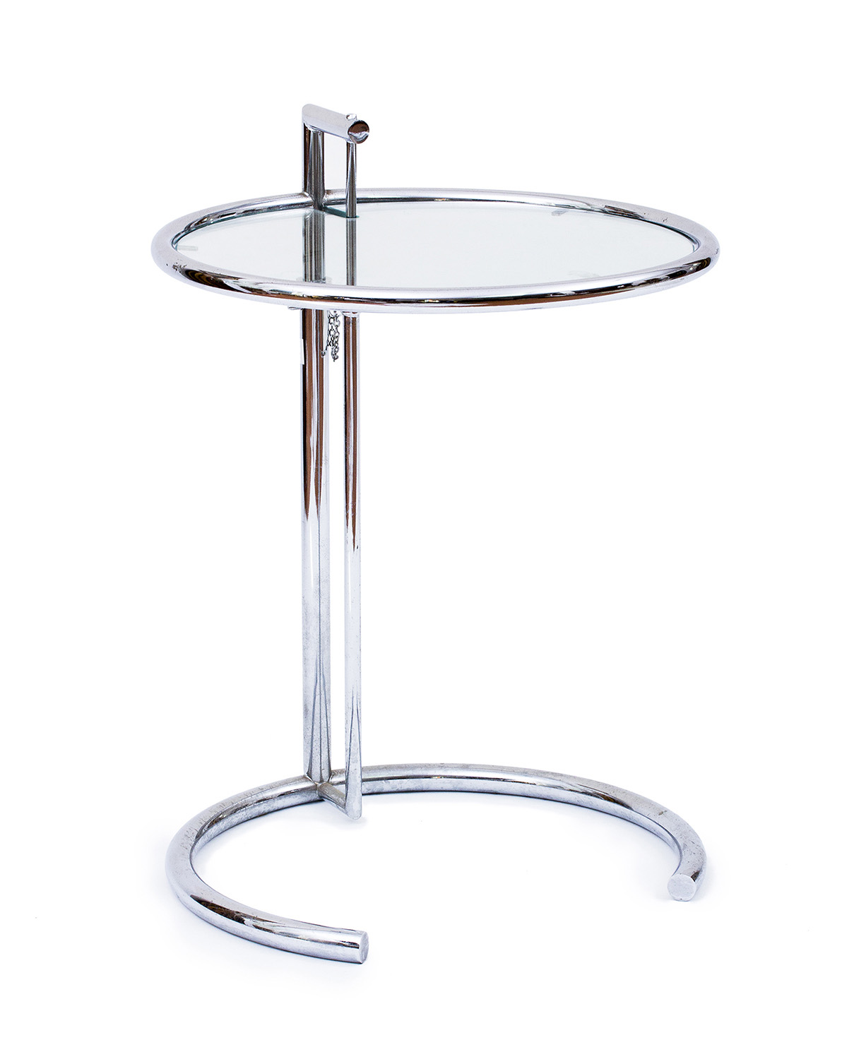 EILEEN GRAY (disegno di) Gueridon modello E 1027, riedizione anni ‘70 Struttura in tondino di acciaio cromato e vetro, piano d’appoggio regolabile, h. 70, d. 50,6 cm
