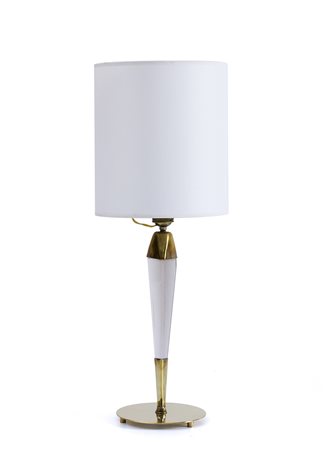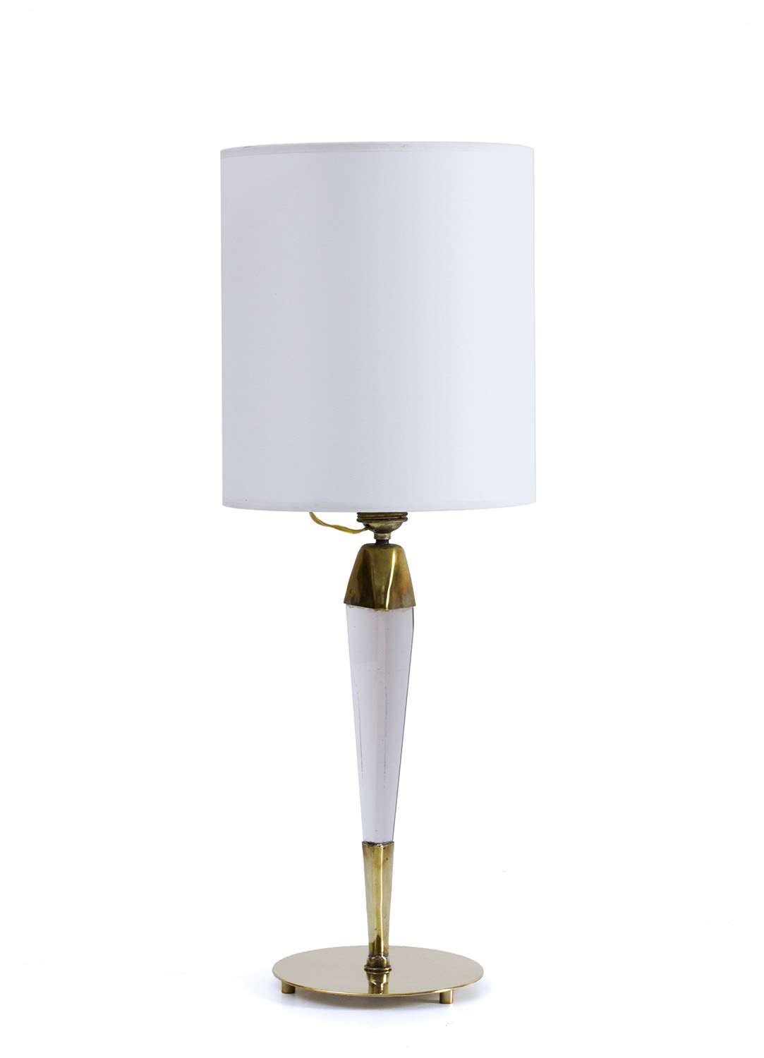 FONTANA ARTE (nello stile di) Lampada da tavolo, anni ‘40/‘50 Struttura in cristallo ed ottone, paralume in stoffa bianca, h. 62, d. 22 cm
