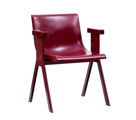 ETTORE SOTTSASS Poltroncina “Olivetti Synthesis 45”, 1972 Plastica stampata e metallo laccato rosso scuro, 75 x 57 x 46 cm Il progetto del sistema di arredamenti per ufficio Synthesis 45 fu elaborato per Olivetti da Ettore Sottsass, allora responsabile del design dell'azienda di Ivrea, tra il 1970 e il 1972. Scrivanie, sedie, poltroncine, cassettiere, classificatori e accessori vari, tutti prodotti negli stabilimenti Olivetti Synthesis di Massa Carrara, facevano parte di un sistema di arredo rivoluzionario per l'epoca: Synthesis 45 è, infatti, basato su una griglia spaziale a moduli da 45 cm - da cui il nome – che scandisce le grandezze dei mobili per l'ufficio, tenendo conto dello spazio necessario per l'alloggiamento delle macchine elettroniche. PUBBLICAZIONI: Sottsass Olivetti Sinthesis. Sistema 45, catalogo della mostra, Venezia, Negozio Olivetti, 28 maggio-23 ottobre 2016, Edizioni di Comunità, ill. p. 52 CONDITION REPORT: lieve abrasione ad un bracciolo