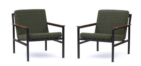 I.S.A. (INDUSTRIA SALOTTI ARREDAMENTI) Coppia di poltrone, anni ‘50 Struttura in metallo brunito con braccioli in legno e seduta con molleggio elastico dotata di cuscini imbottiti e rivestiti in tessuto verde scuro, 74 x 65 x 72 cm Ambedue con etichetta originale: “Trafilisa molleggio brevettato”