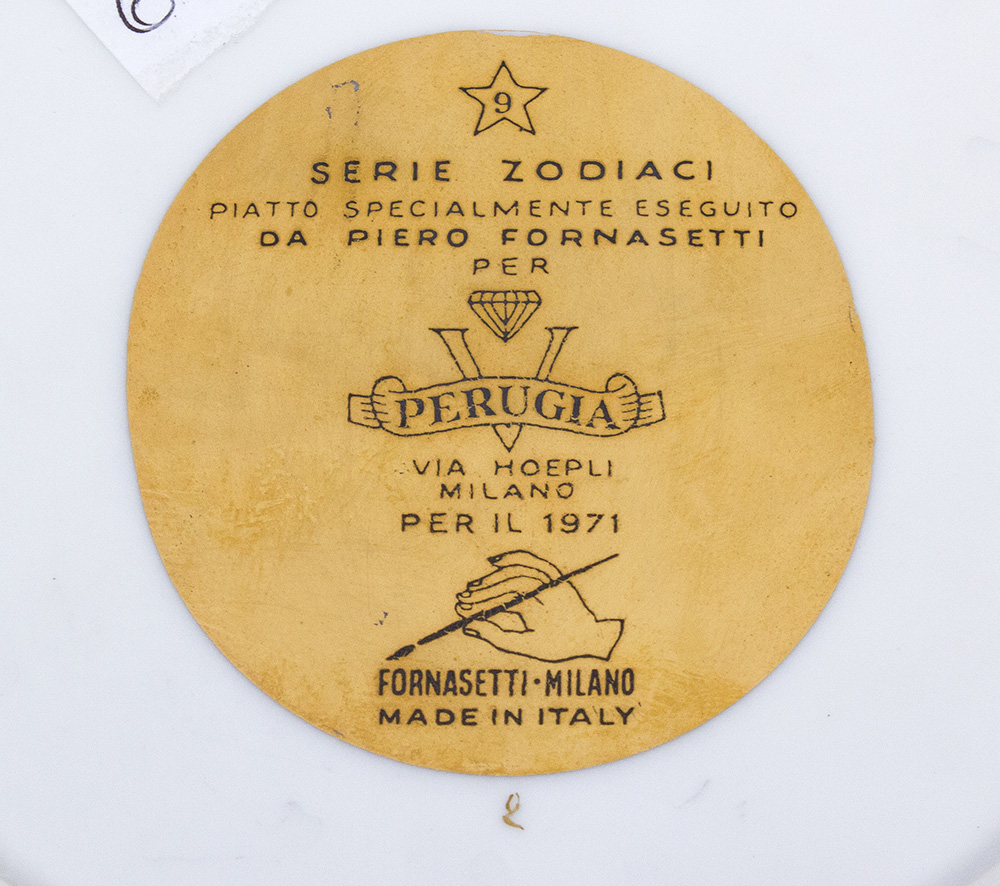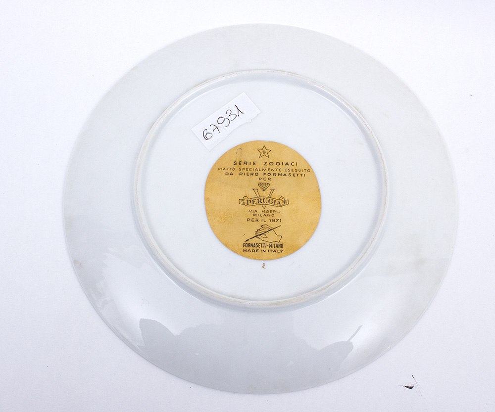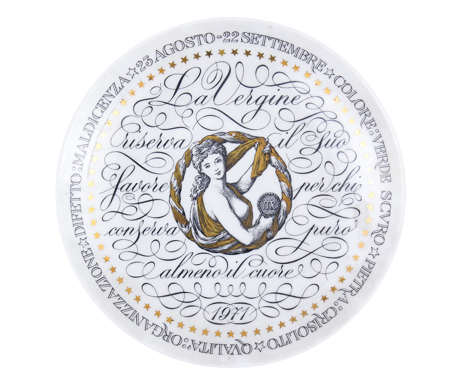 PIERO FORNASETTI Piatto “La Vergine” della serie “Zodiaci”, 1971 Porcellana decorata in nero e oro, d. 21 cm Simbolo della vergine nel cavetto contornato dalla scritta: “La Vergine riserva il suo favore per chi conserva puro almeno il cuore. 1971” Data e punti caratteristici del segno zodiacale lungo la tesa Sul retro etichetta con scritto: “Serie Zodiaci. Piatto specialmente eseguito da Piero Fornasetti per Perugia, via Hoepli Milano, per il 1971. Fornasetti Milano Made in Italy” e simbolo grafico