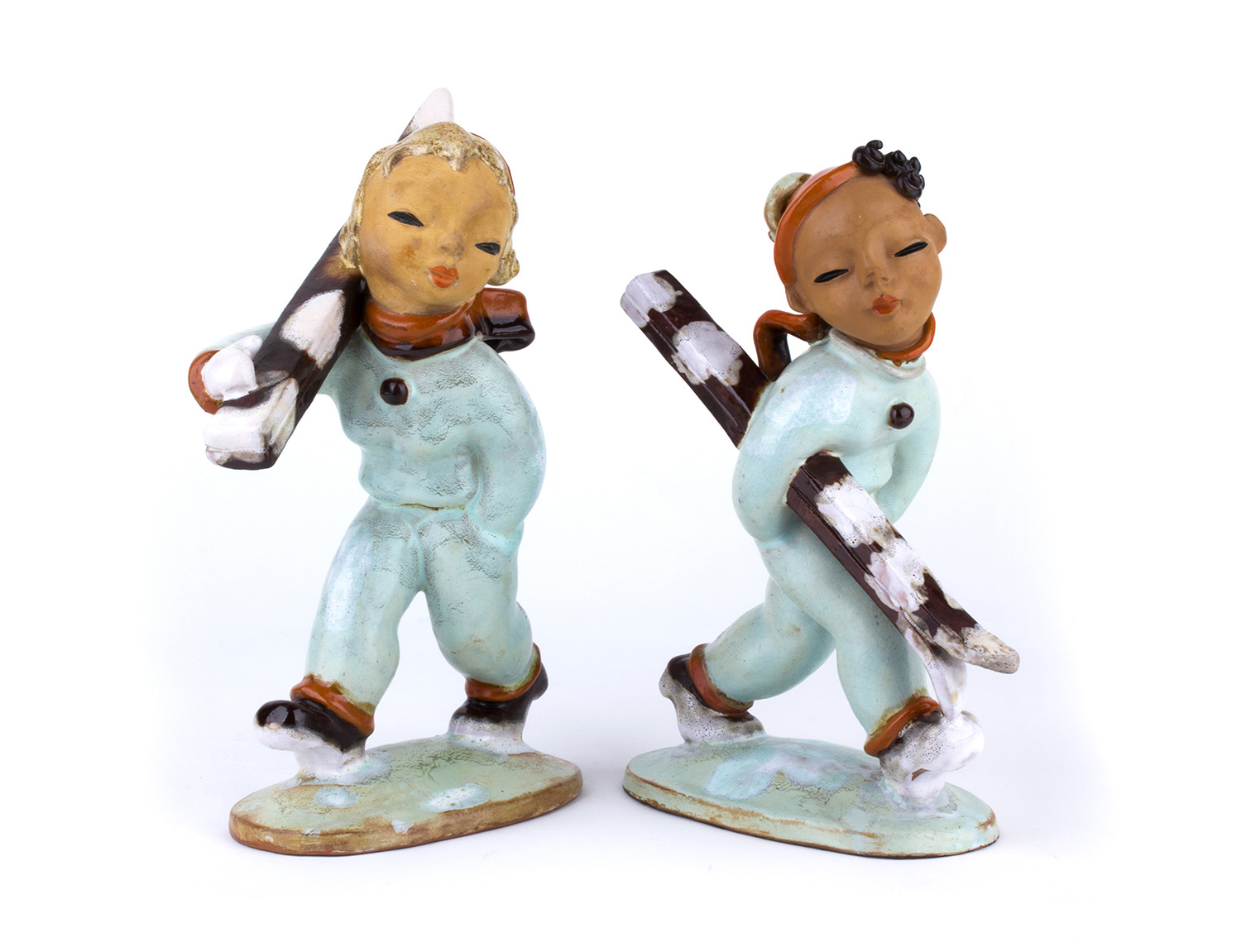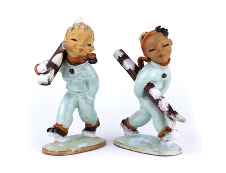 GOLDSCHEIDER - VIENNA Coppia di sciatori, anni ‘30 Due figure di sciatori, una maschile e l’altra femminile, in terracotta maiolicata e dipinta a policromia, h. 24 cm (cada uno) Marchio sotto la base di entrambi: Goldscheider Wien Made in Austria