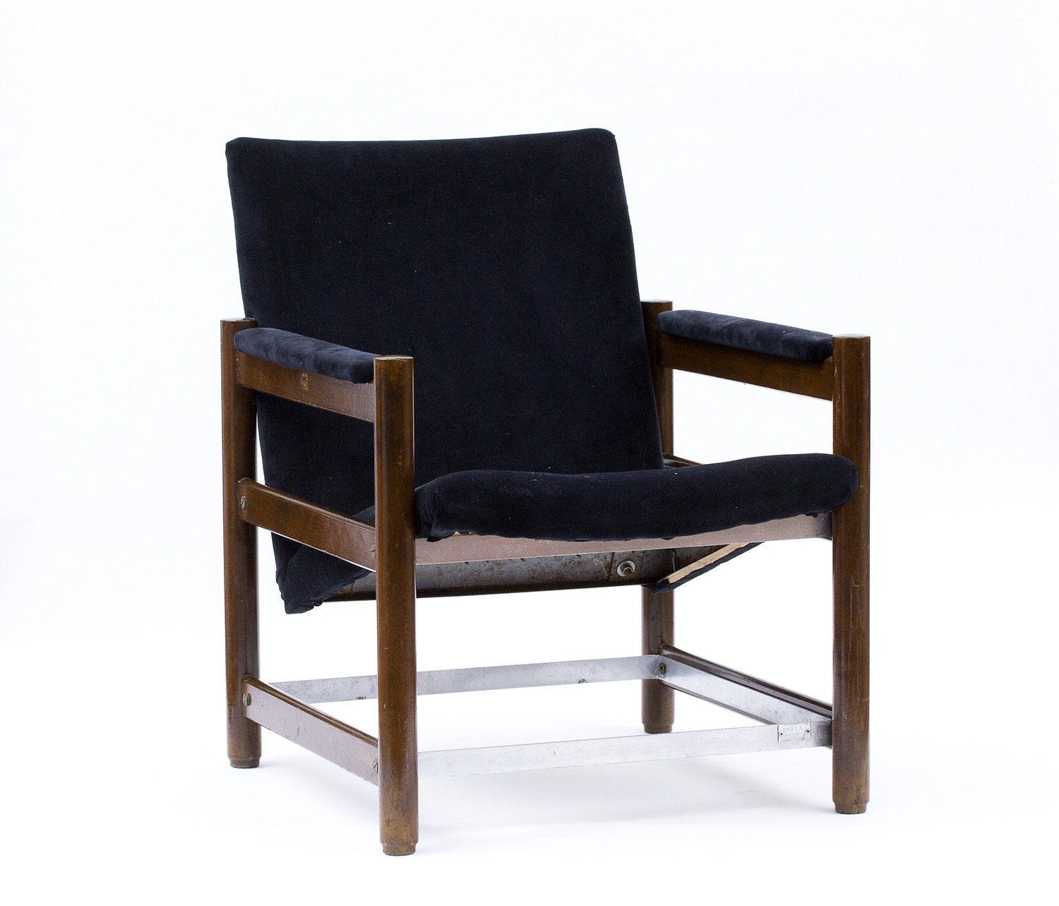 DAL VERA ANTONIO & FIGLI Poltrona , anni ‘50 Struttura in legno e metallo, con seduta asportabile e braccioli imbottiti e rivestiti in velluto nero, 77 x 60 x 67 cm circa Marchio: Dal Vera Spa Conegliano Italia La manifattura, attiva dal 1884 al 1984 nello stabilimento di Conegliano Veneto e in altre sedi, è nota soprattutto per la produzione di mobili in giunco e, dalla fine degli anni Venti, anche in legno curvato. Dagli anni Cinquanta in poi, per adeguarsi alle esigenze dell’epoca, ha realizzato anche mobili di diversa e più moderna fattura.