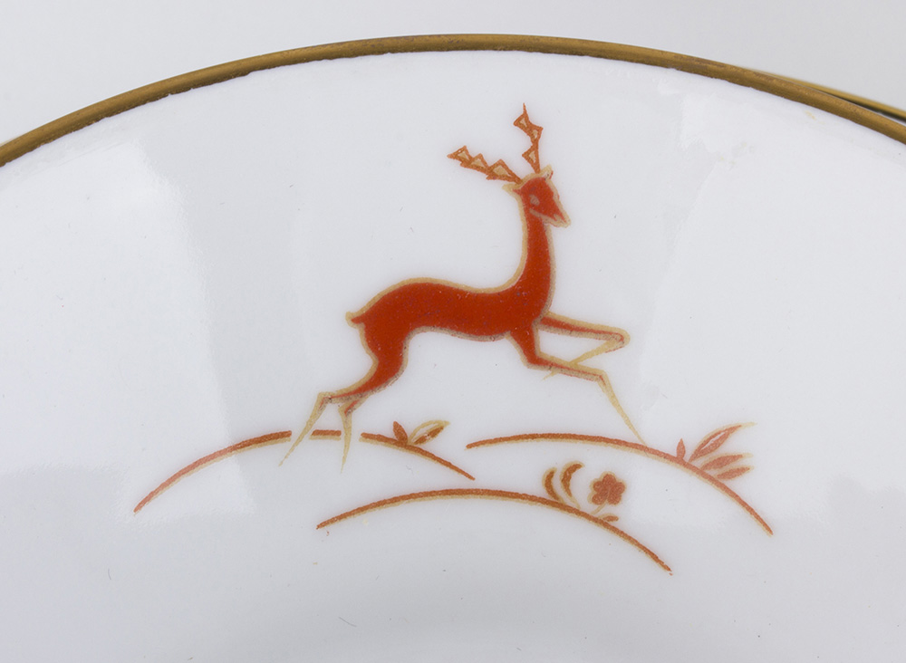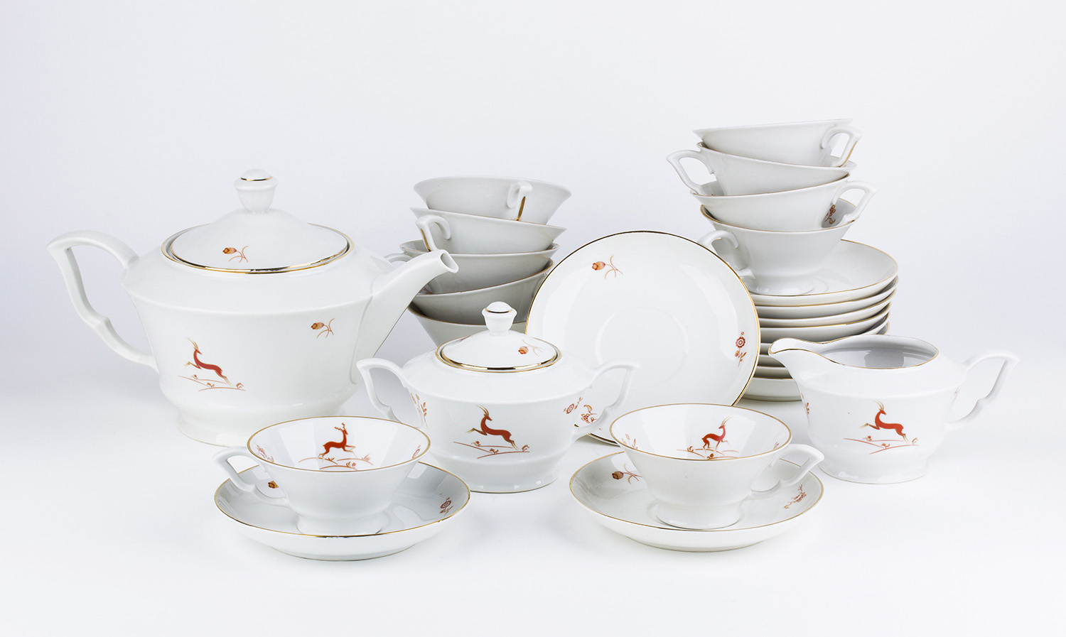 RICHARD GINORI - DOCCIA Servizio da tè composto da undici tazzine, undici piattini, una lattiera, una zuccheriera e una teiera, anni ‘30 Porcellana bianca decorata a motivo di antilopi stilizzate in color corallo e oro Marchio sotto ogni elemento: Richard Ginori