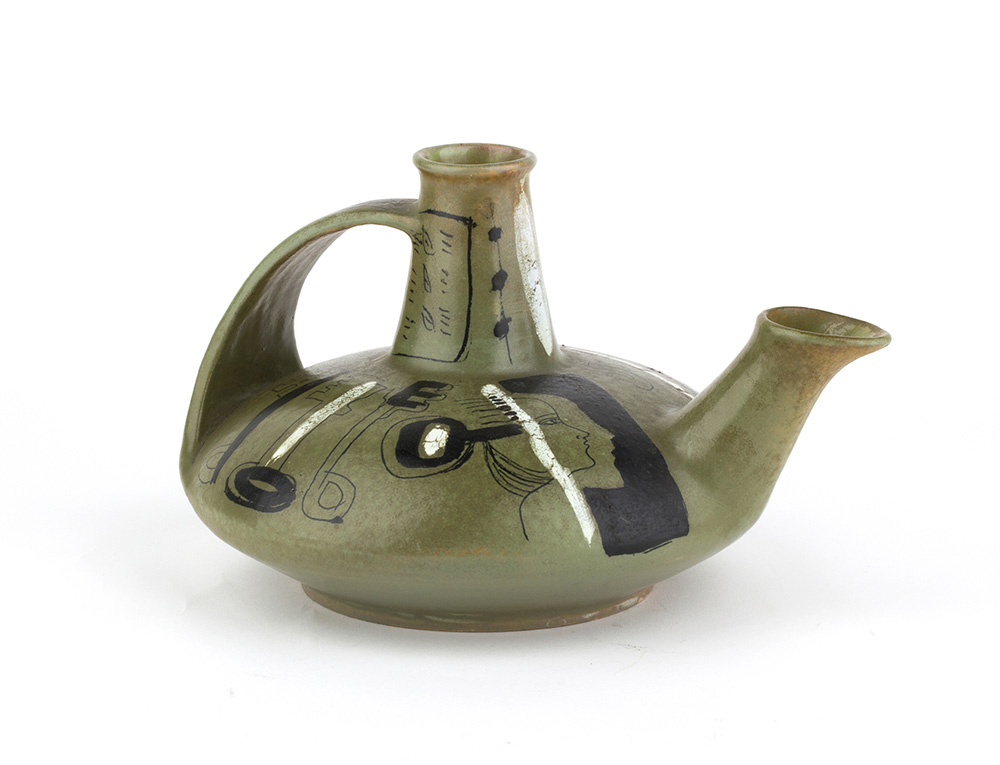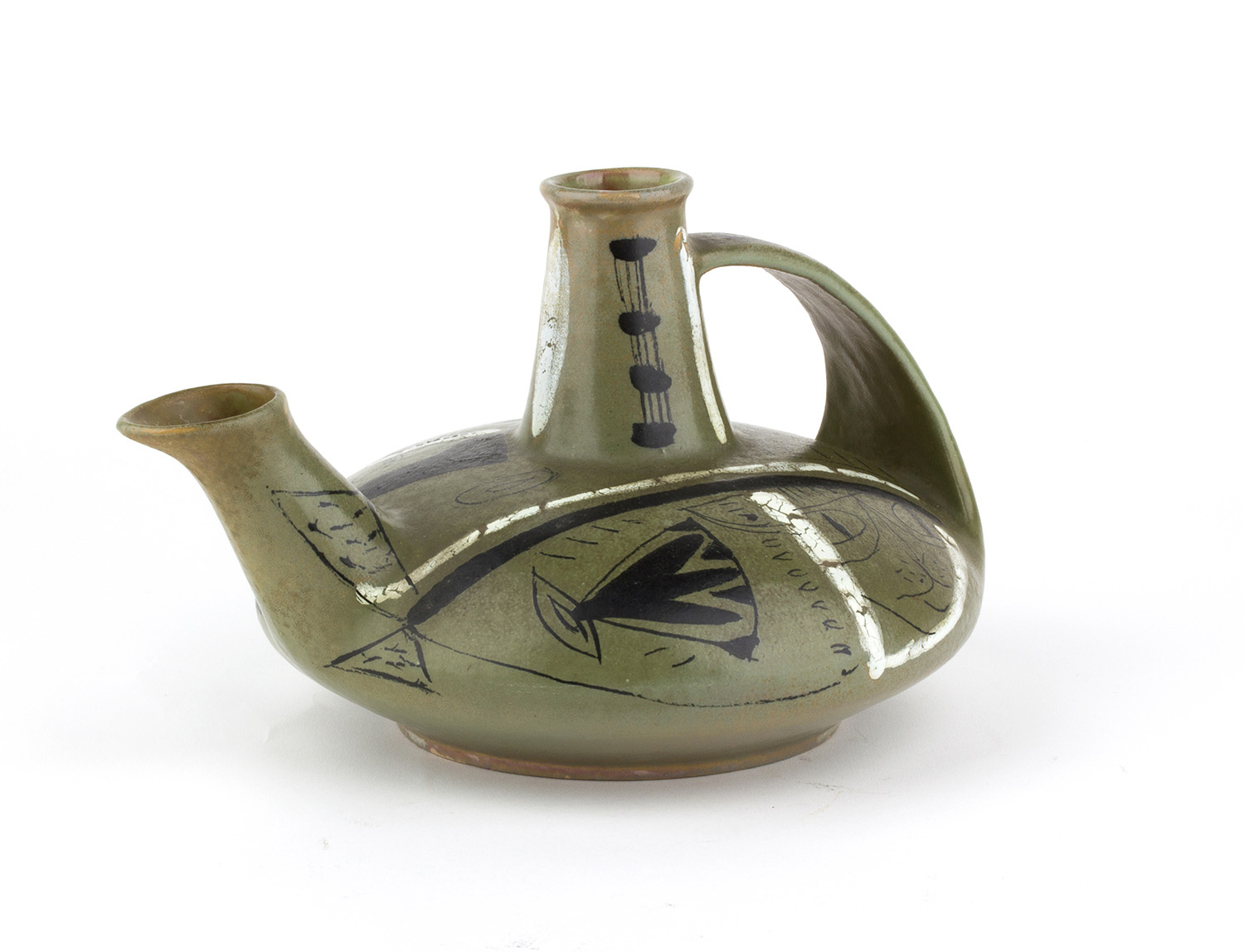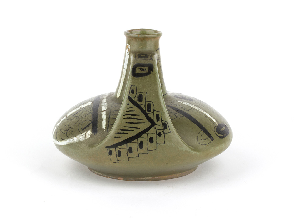 BRUNO BARATTI - PESARO Fiasca con profili e motivi astratti, anni ‘50 Terracotta smaltata in verde oliva e dipinta in nero, 15 x 23 x 19 cm Firma e luogo sotto la base: Baratti Pesaro