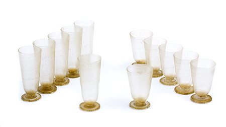 BAROVIER - MURANO Servizio di dodici bicchieri, anni ‘40 Composto da 6 bicchieri da vino e sei da acqua in vetro soffiato e zigrinato con spruzzature in oro, h. 14,5, h.11 cm (rispettivamente)