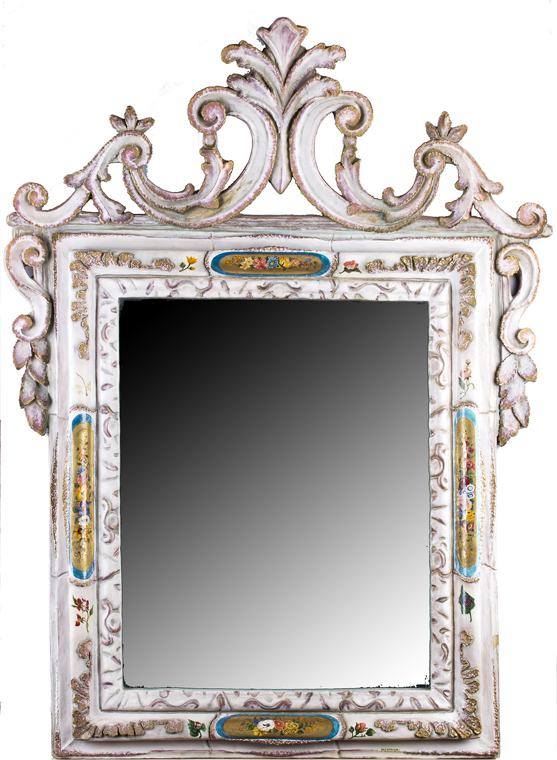 PIETRO MELANDRI Grande specchiera, anni ‘50/’60 Struttura in legno e metallo, cornice in terracotta modellata a rilievo in stile rococò e dipinta con motivi floreali in policromia e oro, 93 x 68 cm Firmata per esteso in basso a destra: MELANDRI