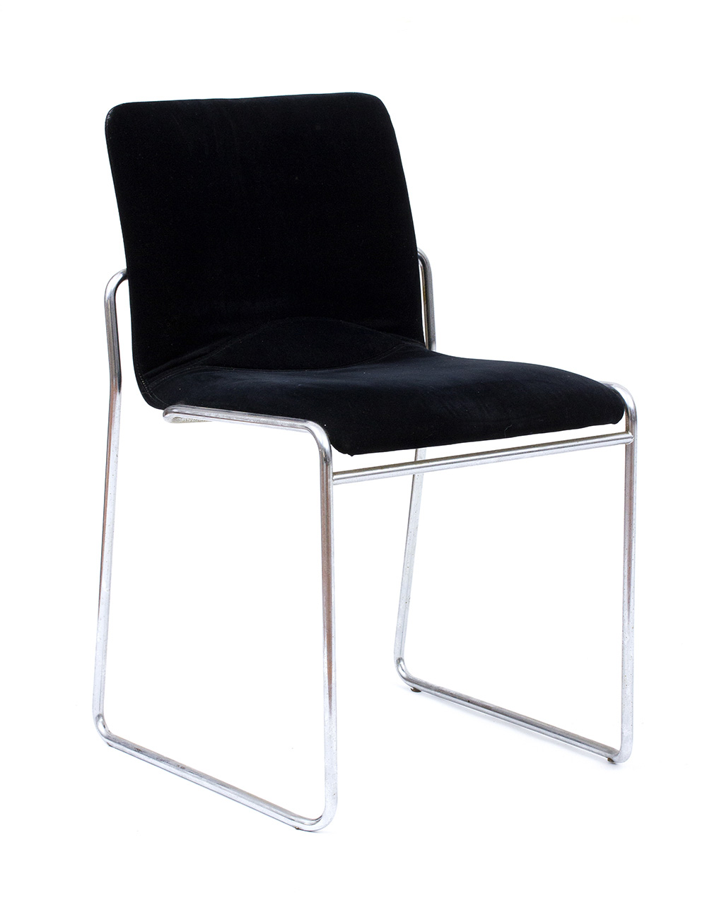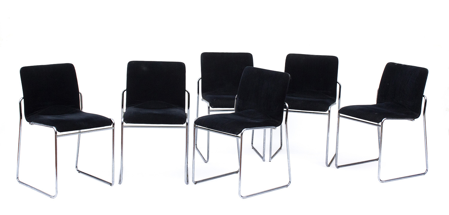 KAZUHIDE TAKAHAMA (attribuito a) Sei sedie in tondino d’acciaio, anni ‘70 Struttura in tondino d’acciaio cromato, seduta imbottita e rivestita in velluto nero, 76 x 47 x 45 cm Esemplare simile in: G. Gramigna, 1950/1980 Repertorio, Milano 1985, p.455