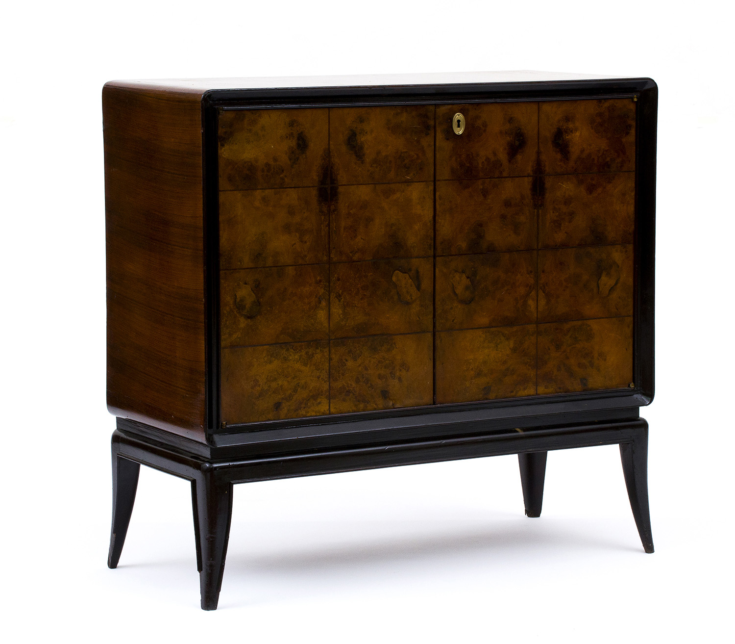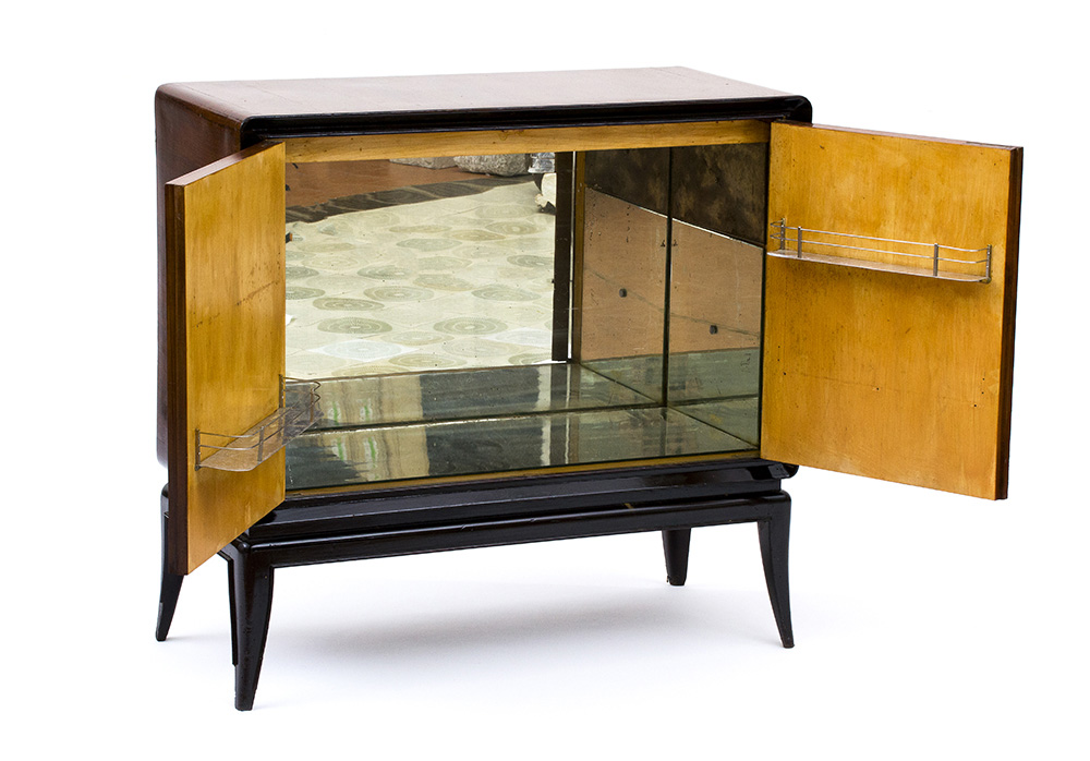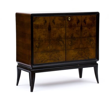 MANIFATTURA ITALIANA Mobile bar, anni ‘40 Struttura impiallacciata in noce e con dettagli in legno ebanizzato, le due ante impiallacciate in radica di noce, interno in legno chiaro rivestito di specchi e con mensoline in metallo porta bicchieri, 92,5 x 97,5 x 42 cm