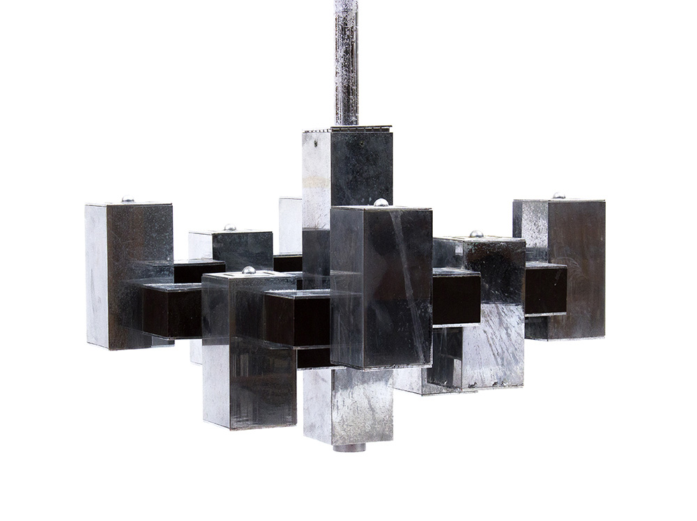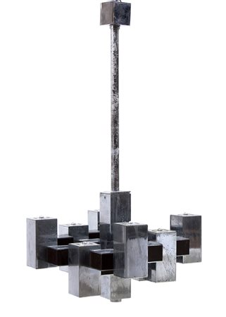 SCIOLARI ILLUMINAZIONE Lampadario “Cubic” a 8 luci, anni ‘70 Struttura in...