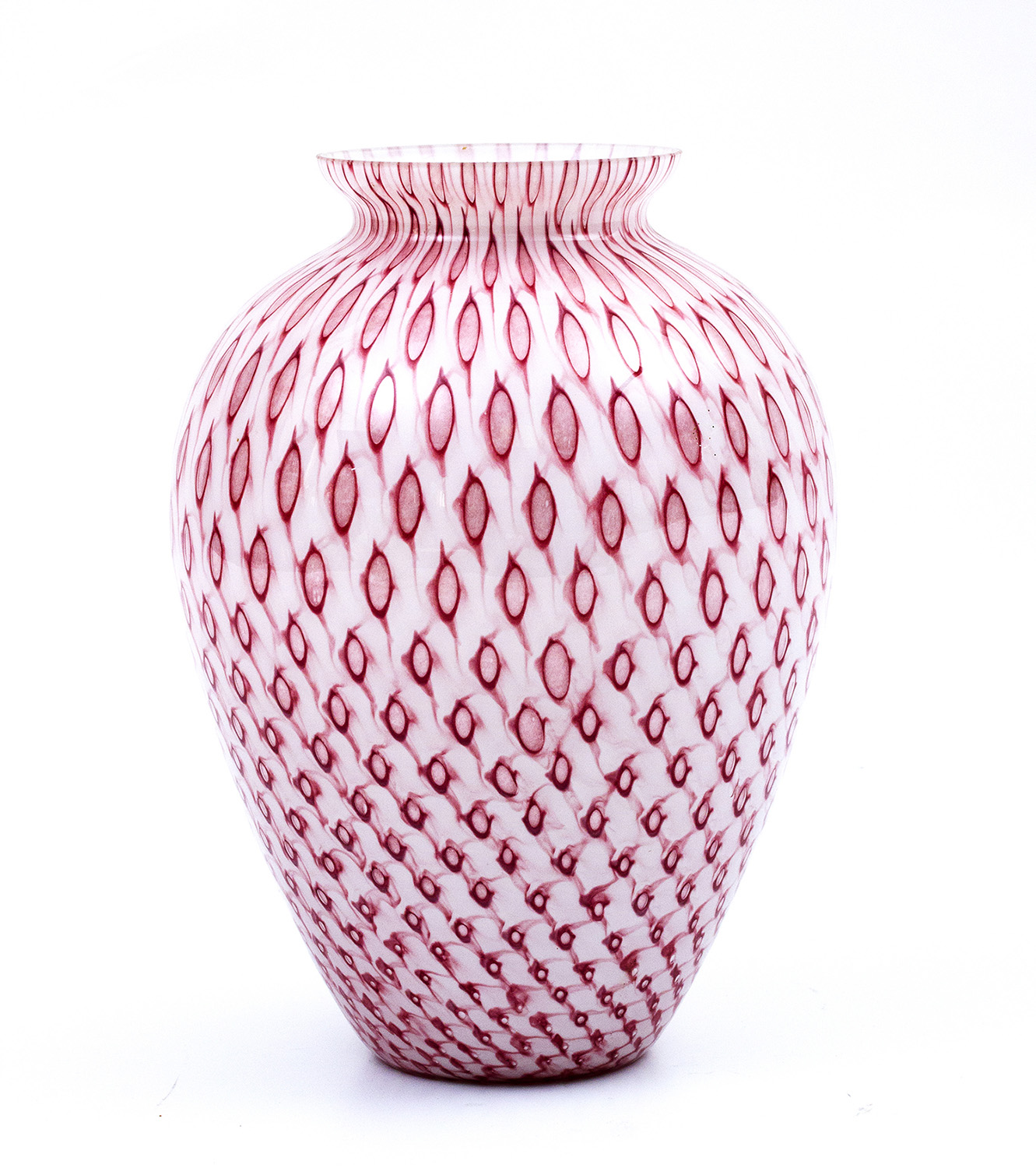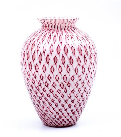 KOSTA BODA - SVEZIA (attribuito a) Vaso, anni ‘70 Vetro soffiato e decorato a losanghe bianche e rosa con inclusione di bollicine, h. 28 cm