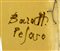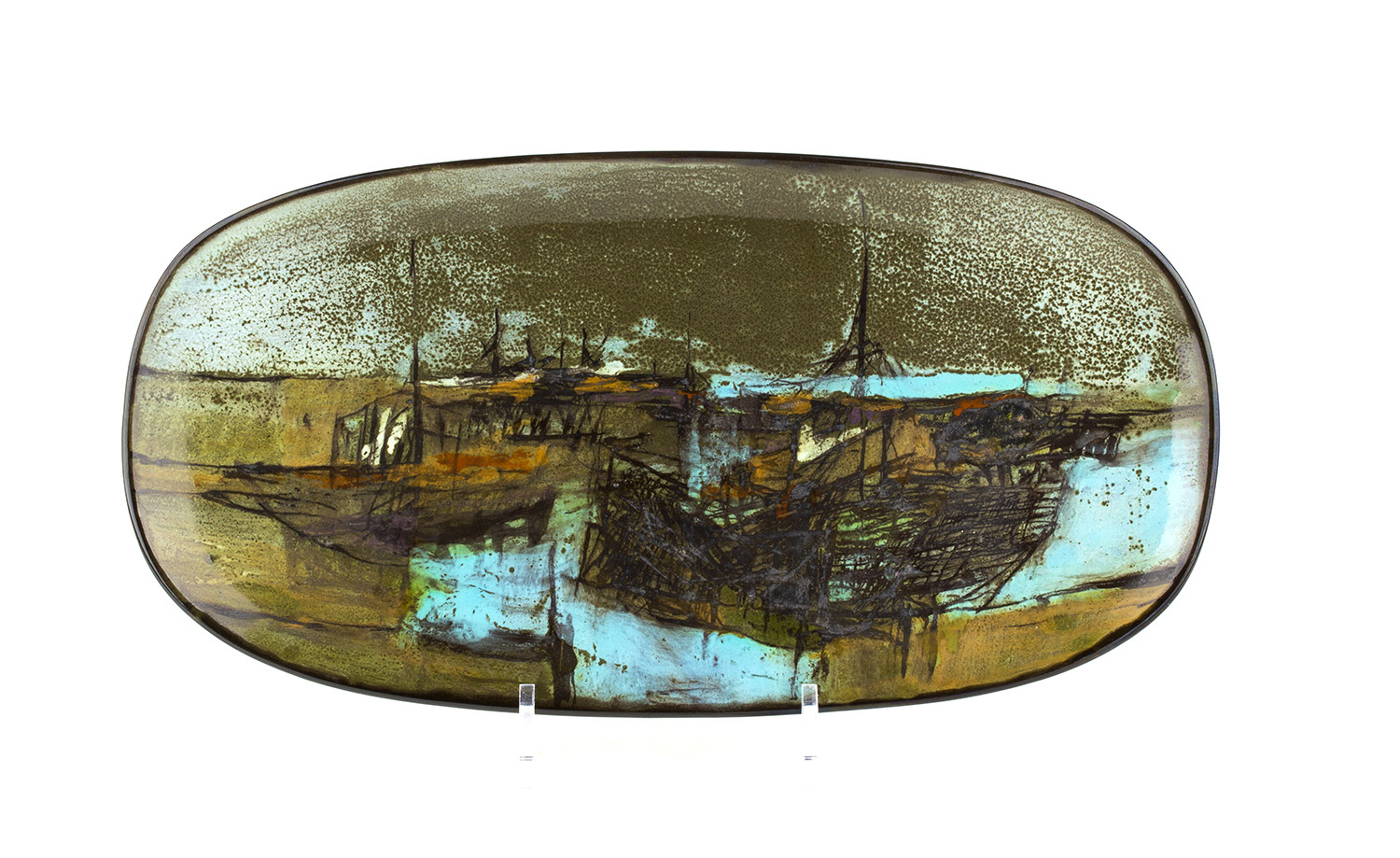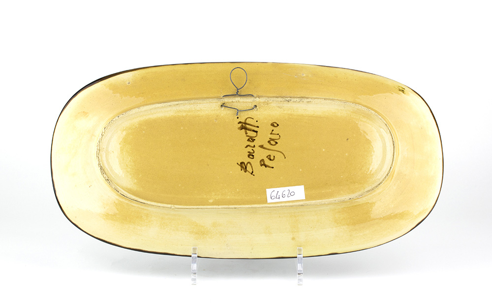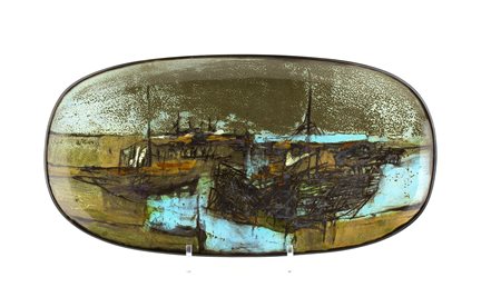 GIAN BATTISTA (NANNI) VALENTINI Piatto ovale con paesaggio stilizzato, anni ‘50 Terracotta smaltata e decorata a policromia con motivi astratti graffiti, 38 x 19,5 x 3 cm Marchio inscritto sotto la base: Baratti Pesaro