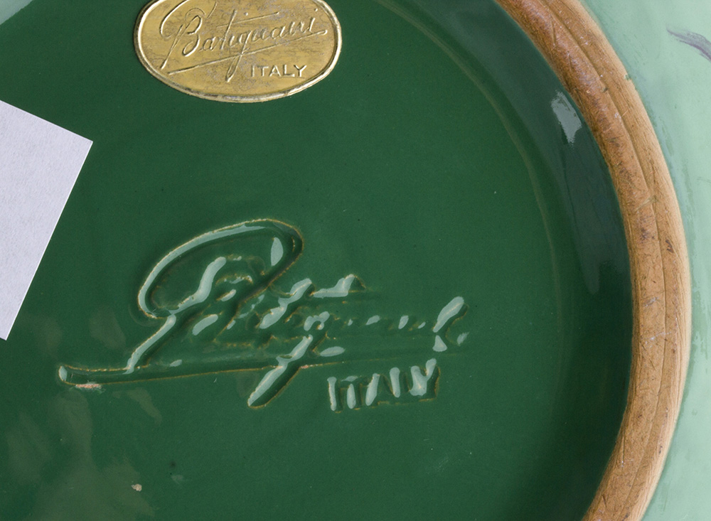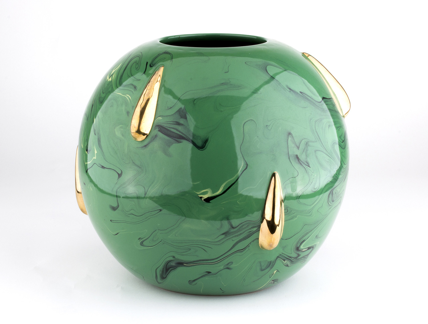 BATIGNANI - FIRENZE Vaso globulare con decoro a gocce in rilievo, anni ‘50 Ceramica dipinta in verde smeraldo marmorizzato, gocce dorate, 21,5 x 21,5 cm Firma ed etichetta sotto la base: Batignani Italy