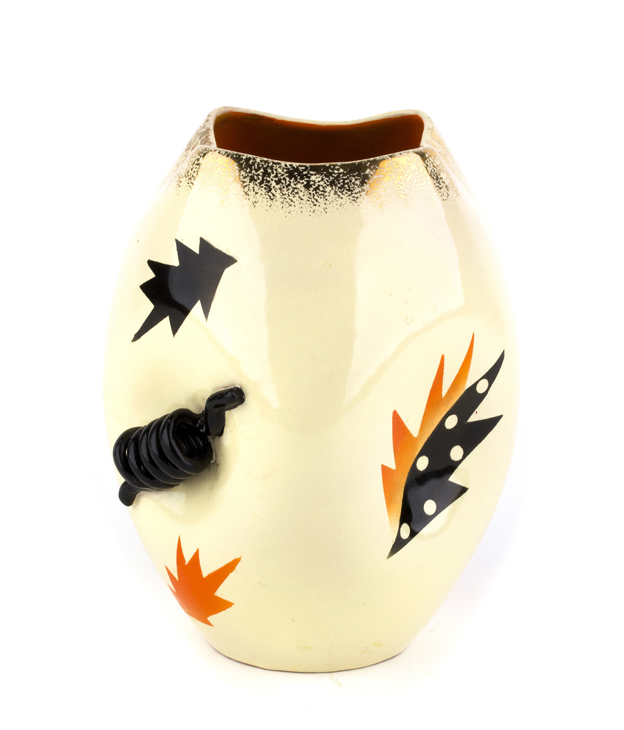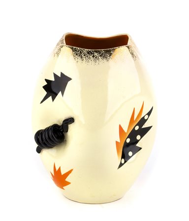 PUCCI - UMBERTIDE Vaso a forma irregolare beige, nero e arancione, anni ‘50 Ceramica dipinta a motivi stilizzati e con spirali nere applicate, h. 17 cm Firma e luogo inscritto sotto la base: Pucci Umbertide Italy