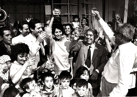VELIO CIONI 29° compleanno di Sophia Loren festeggiata dalla troupe del film “Ieri, oggi e domani”. Brindano con lei Marcello Mastroianni, il marito Carlo Ponti e Vittorio De Sica, regista del film, Roma 29 settembre 1963 Stampa anni 70, gelatina sali d’argento, cm. 18x23,8 Timbro dell’autore
