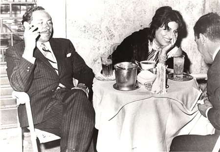 SERGIO SPINELLI Via Veneto. Tennesse Williams e Anna Magnani, che parla con Renzino Avanzo, estate 1958 Stampa alla gelatina sali d’argento, cm. 18x33,5 Sul retro timbro dell’autore