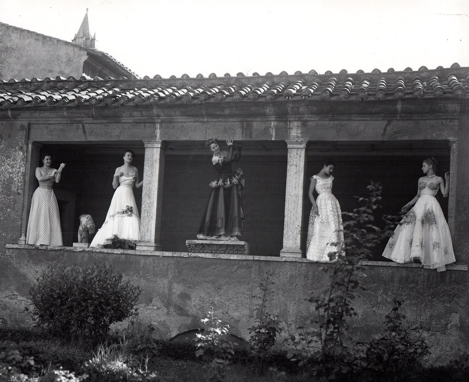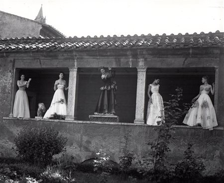 PASQUALE DE ANTONIS Modelle alle Terme di Diocleziano per Tessili nuovi da sin a destr. abiti diFontana De gasperi zezzagattinioni 1948 Stampa al bromuro d’argento, cm. 21,5x 26,5 Timbro sul retro, 1948