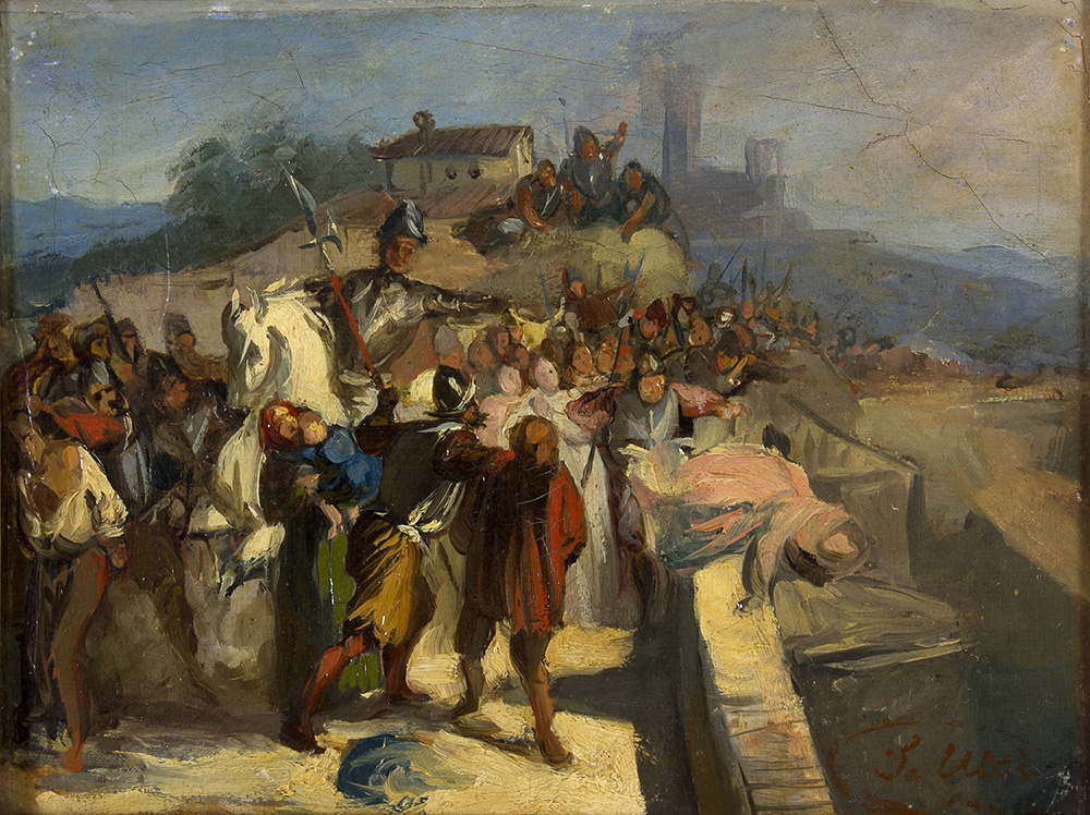 STEFANO USSI L’assedio di Firenze Olio su tela, 20 x 26 cm Al retro timbri vari, etichetta di mostra e etichetta della Collezione Noferini, Firenze