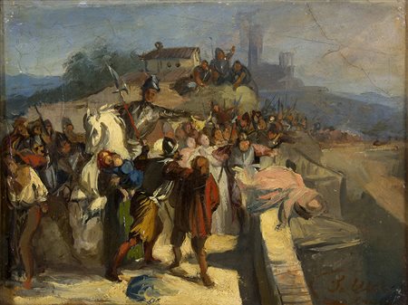 STEFANO USSI L’assedio di Firenze Olio su tela, 20 x 26 cm Al retro timbri...