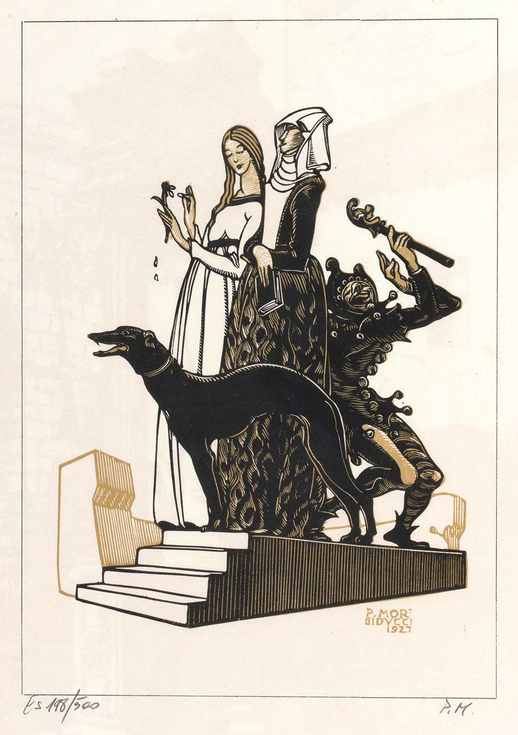 PUBLIO MORBIDUCCI Le donne ed il buffone Xilografia, es 198/500, 22,7 x 16 cm lastra; 28,5 x 19,5 cm Sigla in basso a destra: P. M. Tiratura in basso a sinistra