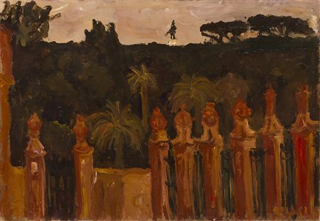 CARLO QUAGLIA Villa Corsini Olio su masonite, 35,2 x 50 cm Firma in basso a destra: Quaglia Al retro autentica della moglie Costanza Valentini con data 5 settembre 1975