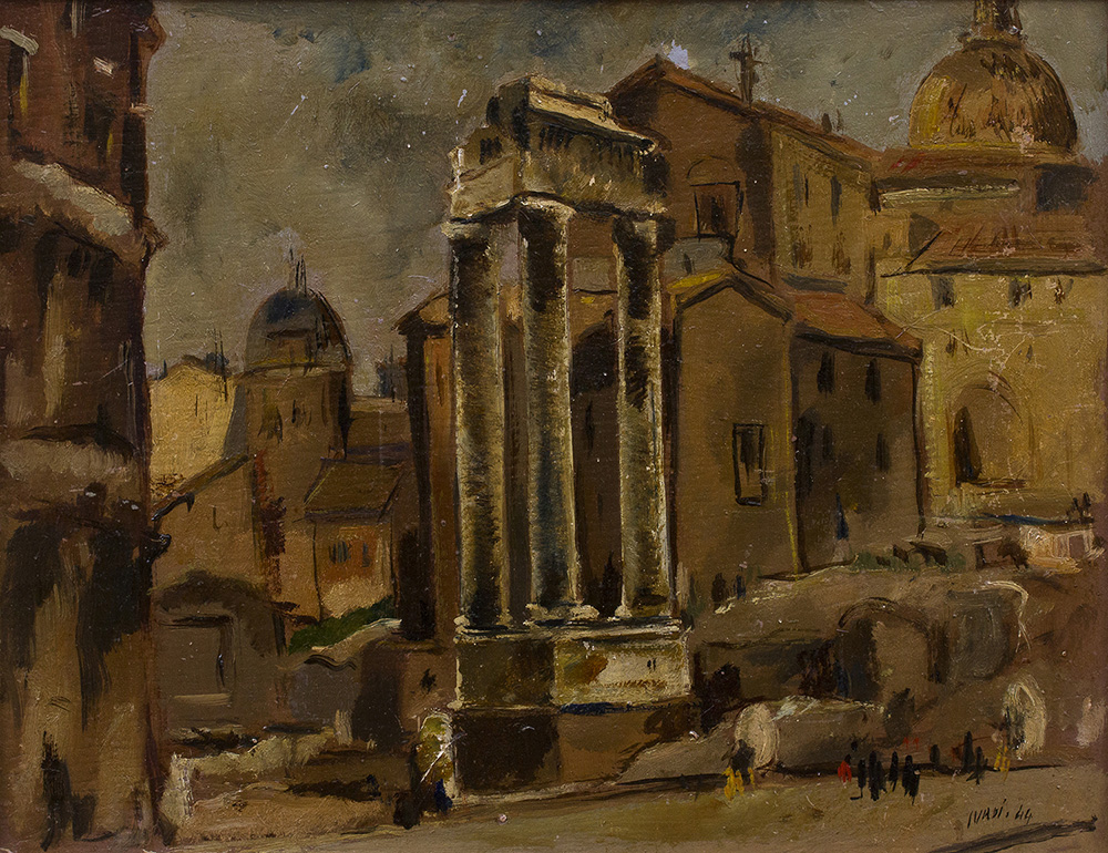 LUIGI SURDI Veduta di Roma, 1944 Olio su cartone, 34,5 x 44,5 cm Firma e data in basso a destra: Surdi 44