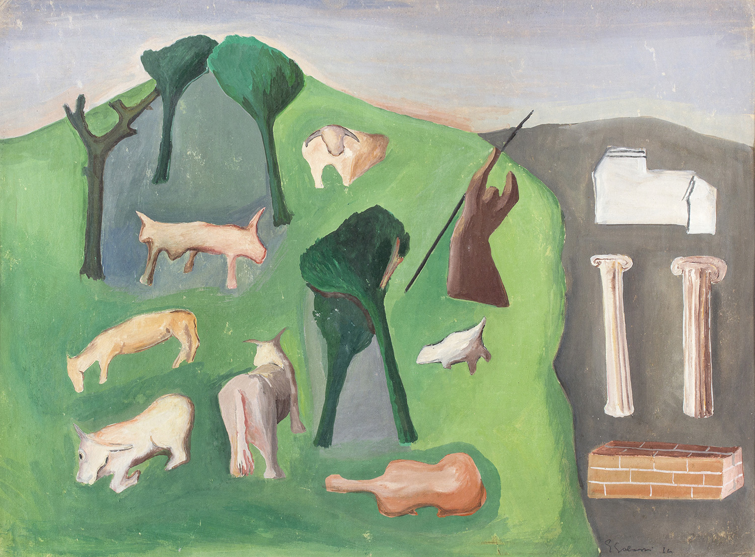 ENRICO GALASSI Scena Metafisica, 1932 Tempera su carta, 37 x 49 cm Firma e data in basso a destra: E. Galassi 32