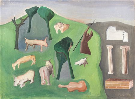 ENRICO GALASSI Scena Metafisica, 1932 Tempera su carta, 37 x 49 cm Firma e...