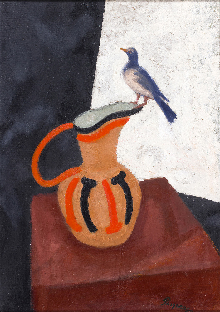 PASQUAROSA MARCELLI BERTOLETTI Uccello e Brocca Olio su cartone, 70 x 50 cm Firma in basso a destra: Pasquarosa Al retro dichiarazione di autenticità