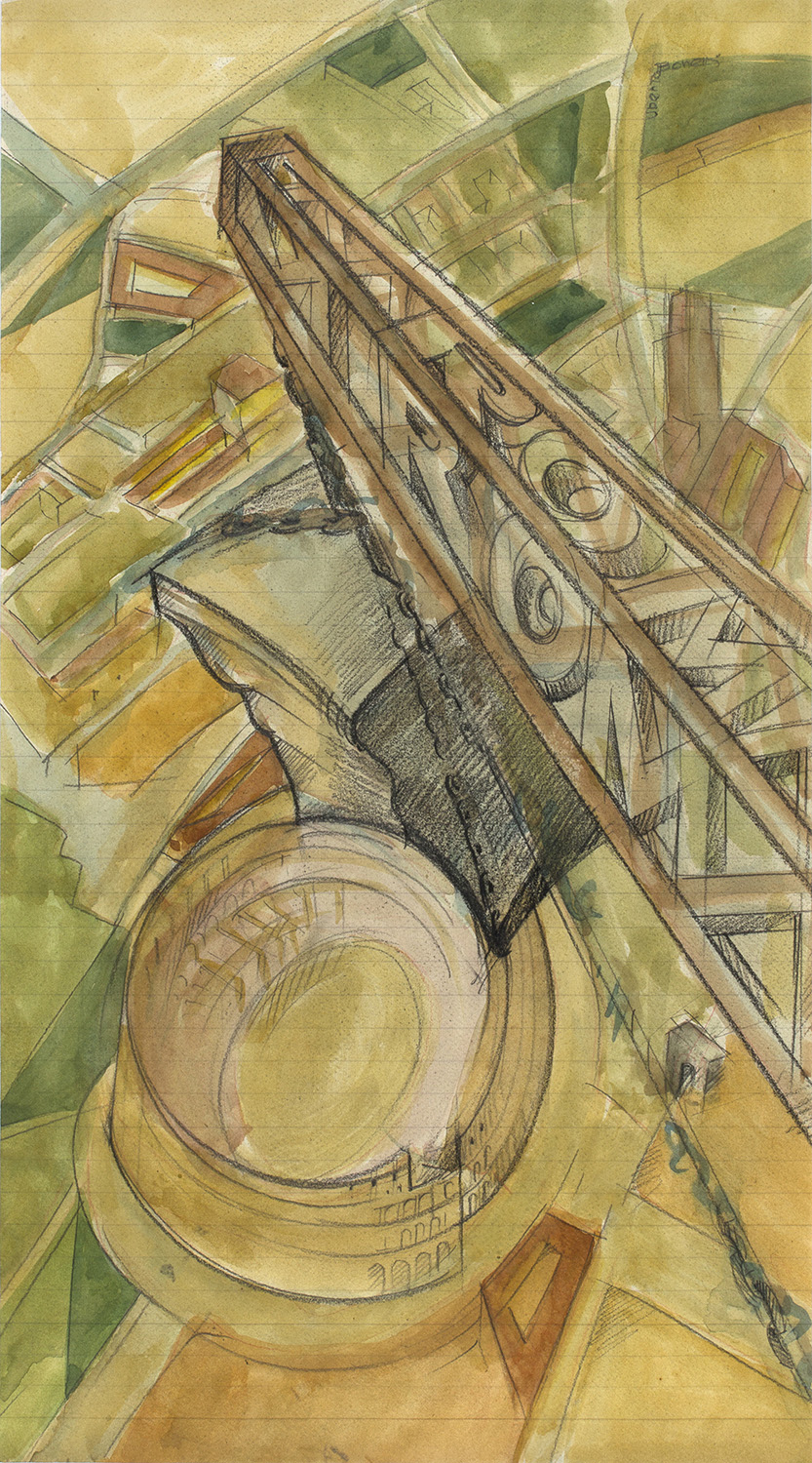 UBERTO BONETTI Gru sul Colosseo Tecnica mista su carta, 46 x 25 cm Firma in basso a destra: Uberto Bonetti