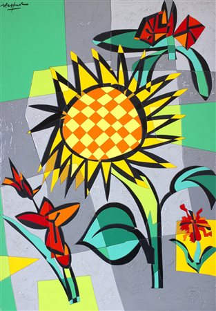 UGO NESPOLO Sunflowers Acrilici su legno, 100 x 70 cm Firma in alto a sinistra: Nespolo Al retro timbro Ugo Nespolo, titolo, tecnica e dimensioni Autentica su foto