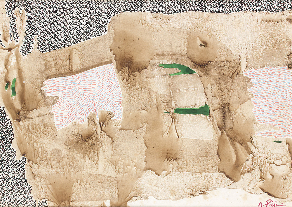 ANDREA PICINI Delitto Tecnica mista su carta, 24 x 38,5 cm Firma in basso al centro: Picini Al retro etichetta con numero d’archivio E.S. 001907