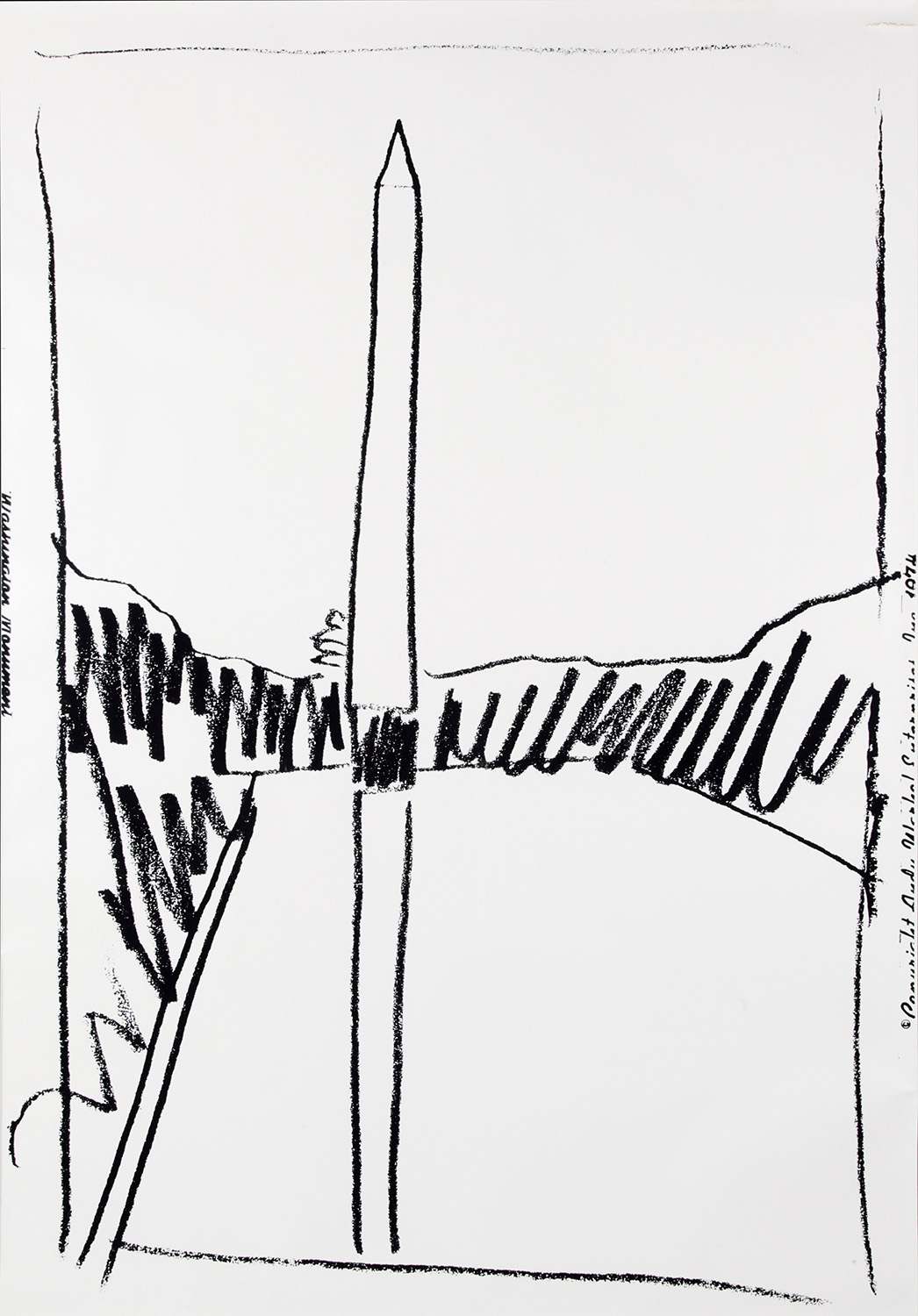 ANDY WARHOL Washington Monument, 1974 Serigrafia su carta da parati, 111,4 x 75,2 cm Unique Print 86.57 - N. IIIB.2 Catalogo Ragionato 'Feldman & Shellmann 1962-1987' Iscrizione stampata sul fronte, margine sinistro:‘Washington Monument’ Iscrizione stampata sul fronte, margine destro: ‘Copyright Andy Warhol Enterprises, Inc., 1974’ Timbro sul retro: ‘Authorized by the Andy Warhol Foundation for the Visual Arts' e 'The Estate of Andy Warhol' Stampa Bill Miller’s Wallpaper Studio Inc., New York ESPOSIZIONI Pop Icons, Galleria Restelliartco, Roma, 20 Gennaio - 6 Febbraio 2015 Just Warhol, Ginevra 19 Marzo - 12 Maggio 2015 PUBBLICAZIONI Catalogo della mostra ‘Pop Icons’, Galleria Restelliartco, Roma, 20 Gennaio - 6 Febbraio 2015, autorizzato da ‘The Andy Warhol Foundation for the Visual Arts,Inc’ by SIAE 2015 Il Catalogo Ragionato Feldman & Schellmann indica che la stampa e' stata realizzata su commissione. Durante i primi anni ’70 Warhol realizza un certo numero di opere per campagne politiche: ‘Vota McGovern’ raffigurante un macabro Richard Nixon, uno dei ritratti di Mao in bianco e nero, Jimmy Carter I e molti altri. La serigrafia puo’ essere considerata una stampa politica ed è possibile che fosse destinata alla mostra di Warhol alla Corcoran Gallery of Art di Washington nel 1975. Esistono un numero limitato di versioni provenienti dalla Fondazione Warhol tra cui un' edizione nel 1983 per la copertina del Washington Post Magazine