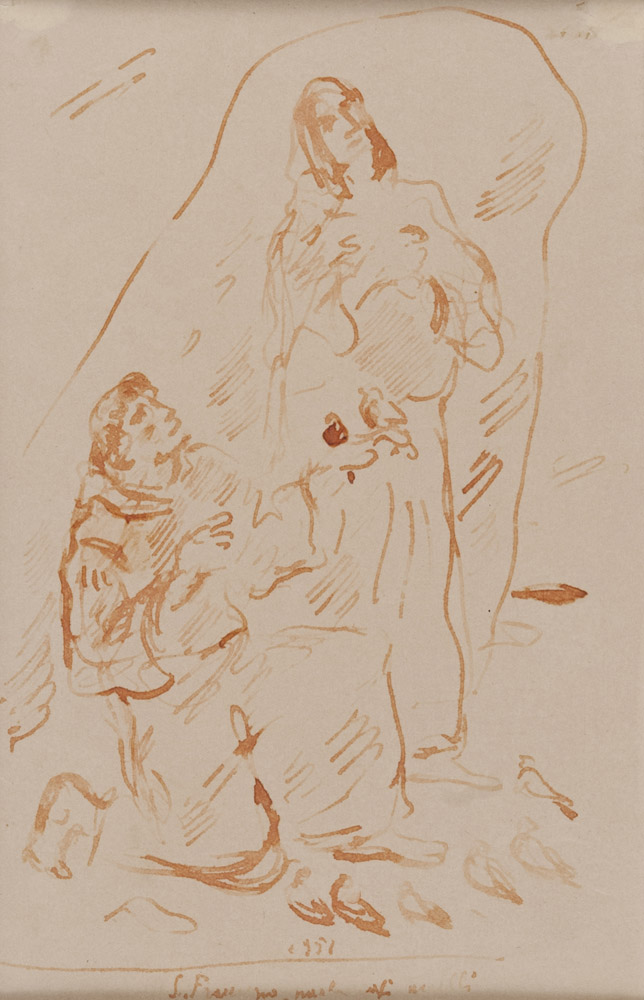 FELICE CARENA (Cumiana 1879 - Venezia 1966) San Francesco parla agli uccelli, 1951 Acquarello su carta, cm. 29 x 18,5 Titolo e data in basso al centro