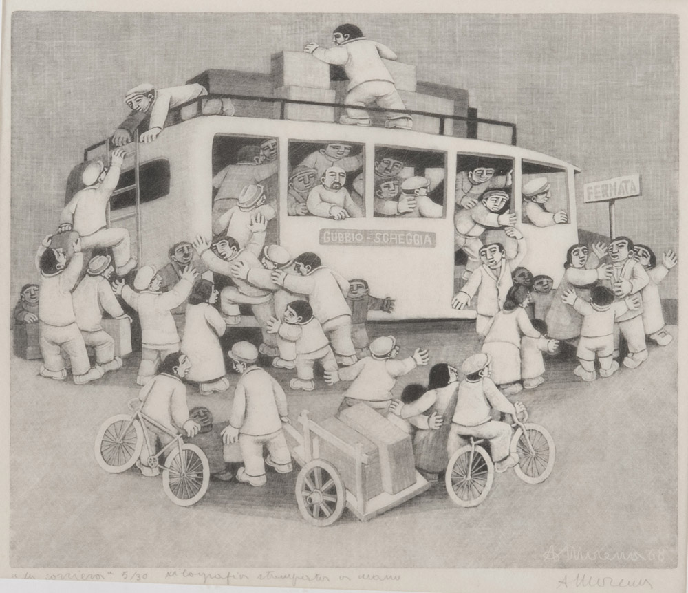 ALBERICO MORENA (Gubbio 1926 - Spoleto 2014) Una corriera, 1968 Xilografia...