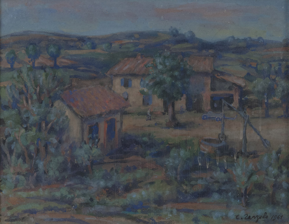 CARLO TERZOLO (Incisa Scapaccino 1904 - Torino 1975) Paesaggio con pozzo, 1961 Olio su faesite, cm. 27 x 34,5 Firma e data in basso a destra