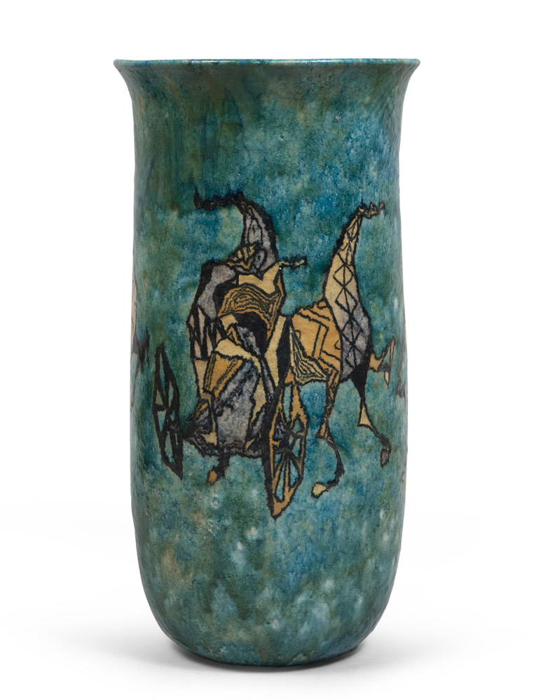 CARLO ZAULI (Faenza 1926 - 2002) Vaso in ceramica smaltata policroma invetriata con fondo verde e decori a bighe e cavalieri, anni '50 Misure, cm. 53,5 x Ø 27 Produzione Faenza Marchio sotto la base