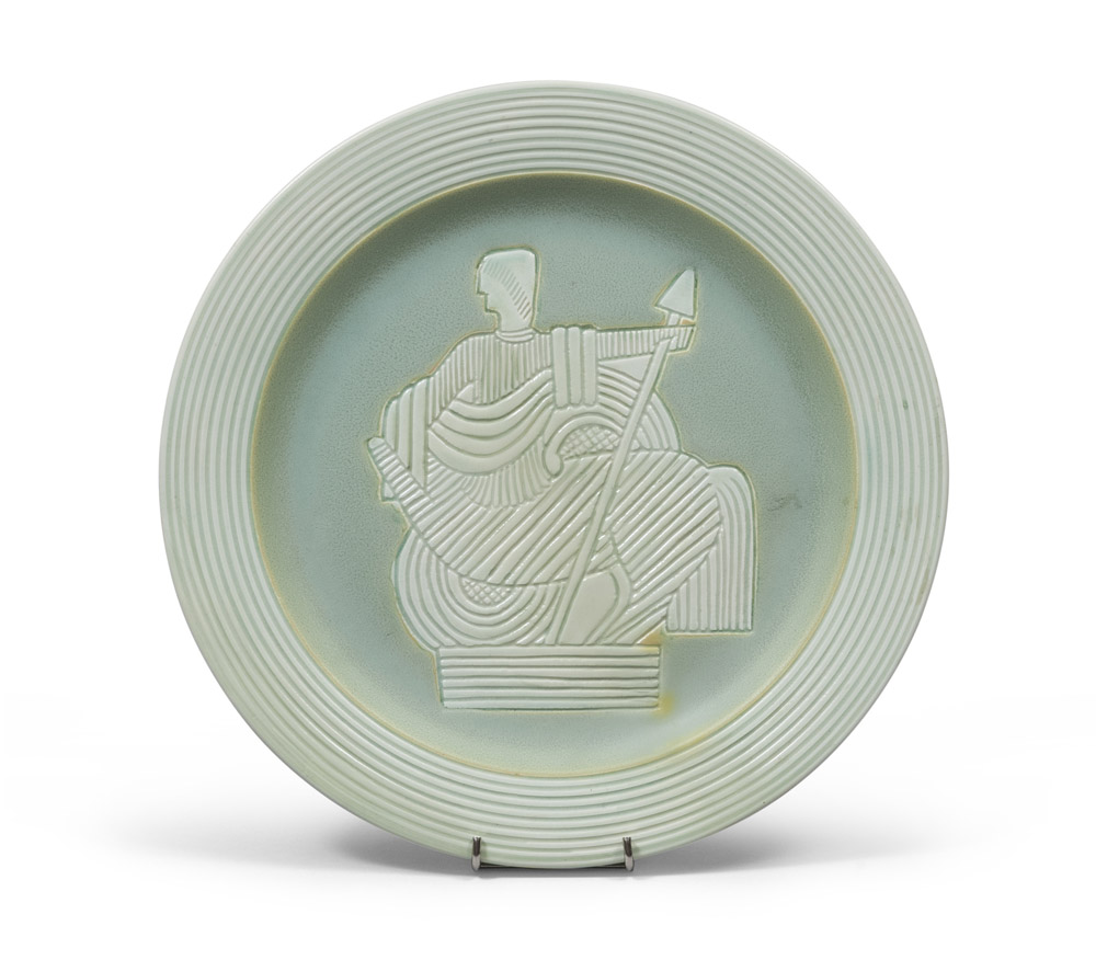 GIOVANNI GARIBOLDI (Milano 1908 - 1971) Piatto in ceramica smaltata con decoro a rilievo con segno zodiacale del Sagittario, anni '30 cm. Ø 33 Produzione Richard Ginori, San Cristoforo, Milano