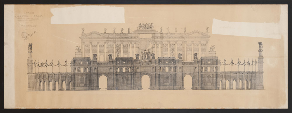 ARMANDO BRASINI (Roma 1879 -1965) Stadio Palestra Italia per San Paolo del Brasile, anni '30 Cianografia Misure, cm. 75 x 202 Firma e titolo al retro Etichette al retro PROVENIENZA Collezione privata, Roma Fori e gore sparse