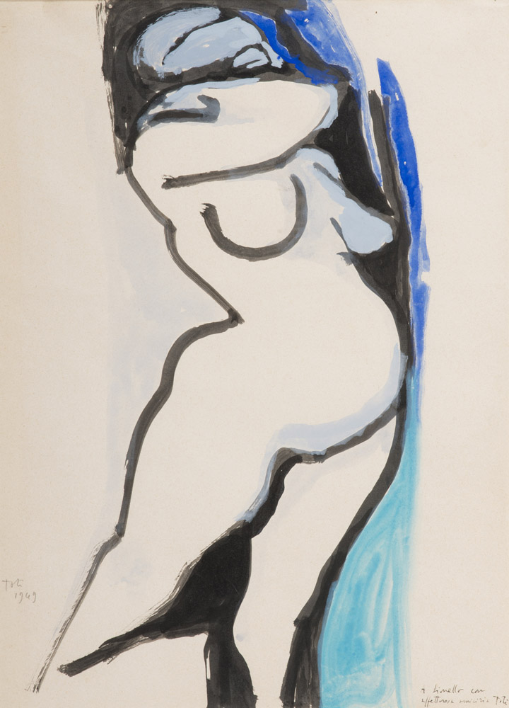 TOTI SCIALOJA (Roma 1914 - 1998) Nudo femminile, 1949 Tempera su carta, cm. 43,5 x 31,5 Firma e data in basso a sinistra Dedica in basso a destra Opera in via di archiviazione presso l'Archivio Toti Scialoja