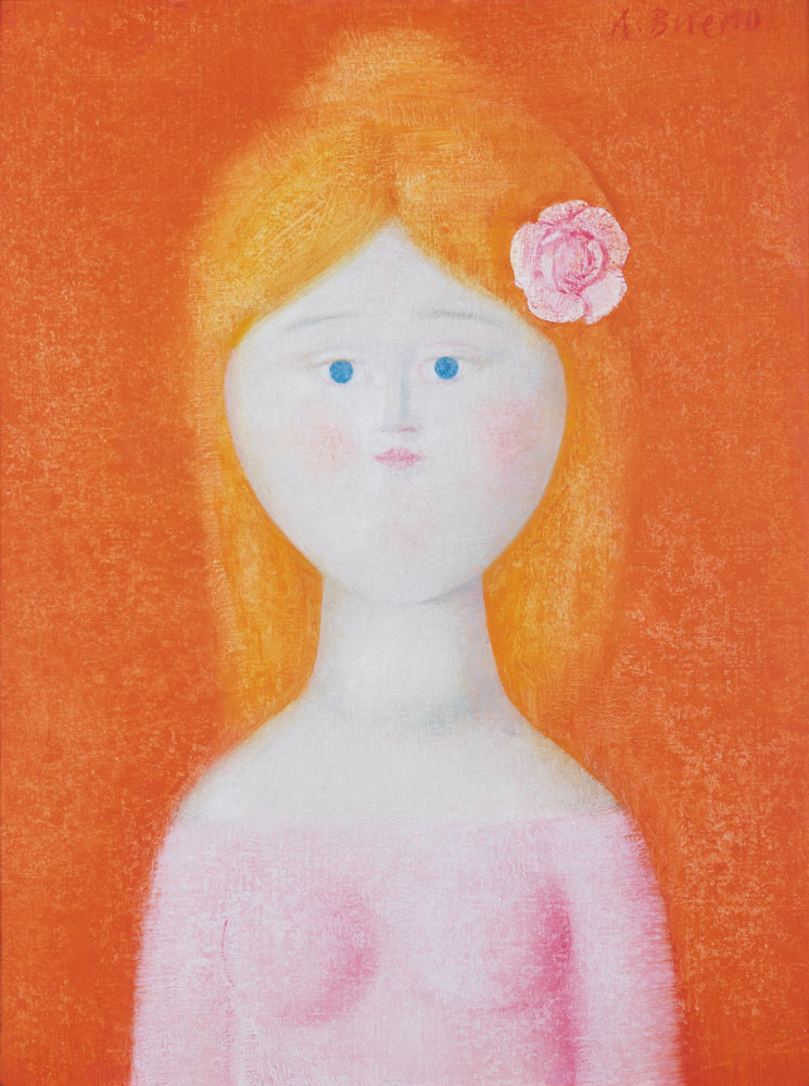 ANTONIO BUENO Berlino (Germania) 21/07/1918 - Firenze 26/09/1984 - Fanciulla con rosa nei capelli, (1976), olio su masonite cm. 40x30, firma in alto a destra, opera registrata presso l'Archivio Antonio Bueno a cura dello Studio R.G.B. come da dichiarazione su foto, opera registrata presso l'Archivio Antonio Bueno a cura di Isabella Bueno come da dichiarazione su foto.