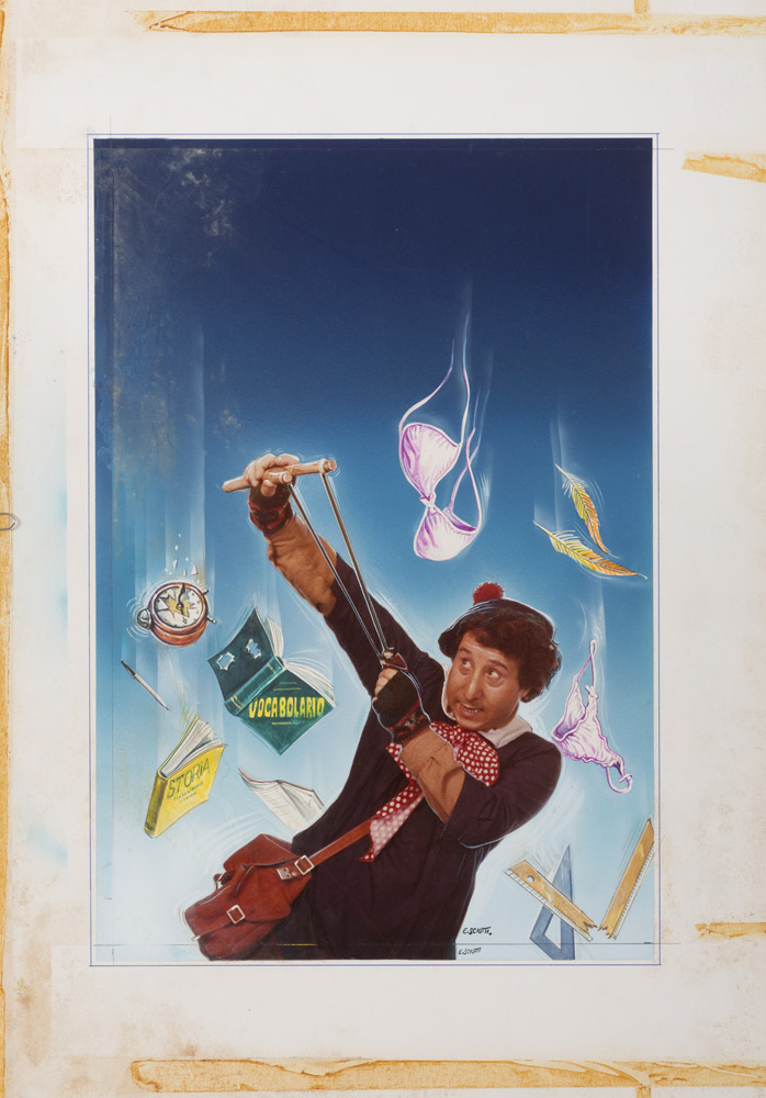 PIERINO CONTRO TUTTI Bozzetto per il manifesto del film del 1981 diretto dal regista Marino Girolami e interpretato da Alvaro Vitali che debutta nel ruolo di protagonista Acquarello, collage su cartoncino e lucido, cm. 51 x 36 Firmato in basso 'E. Sciotti' PROVENIENZA Collezione Società Adriana Chiesa Enterprises, Roma