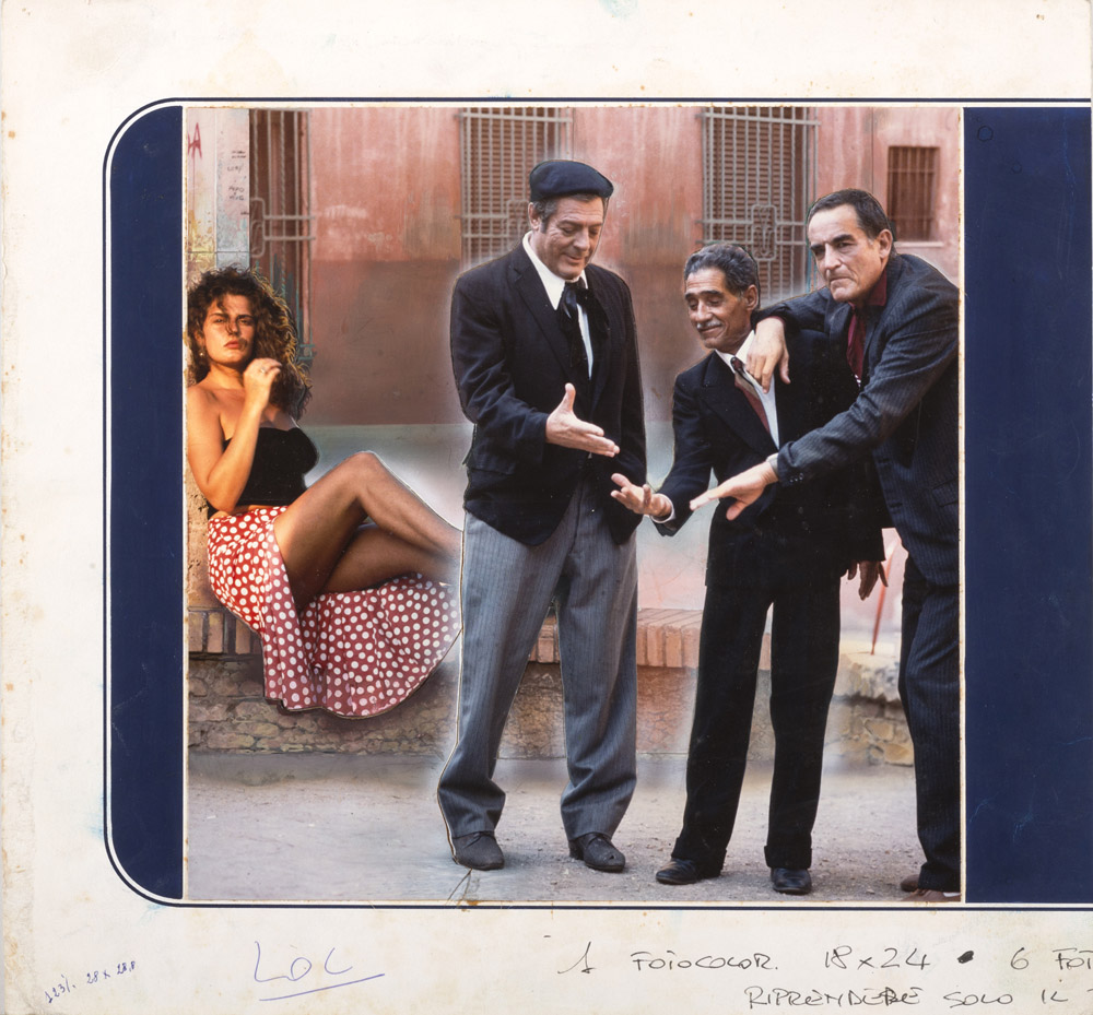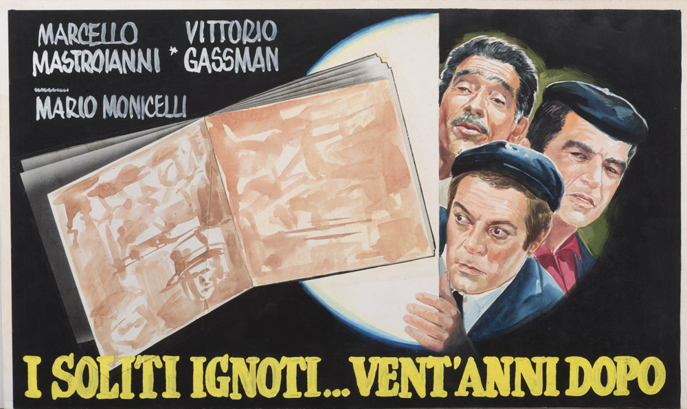 I SOLITI IGNOTI 20 ANNI DOPO Quattro bozzetti per locandine del film del 1985 diretto da Amanzio Todini sequel de 'I soliti ignoti' e 'Audace colpo dei soliti ignoti' con Marcello Mastroianni, Vittorio Gassman, Tiberio Murgia Tecnica mista e collage su cartoncino, cm. 30,5 x 32, cm. 27 x 45, cm. 45 x 61 e cm. 30 x 41,5 PROVENIENZA Collezione Società Adriana Chiesa Enterprises, Roma