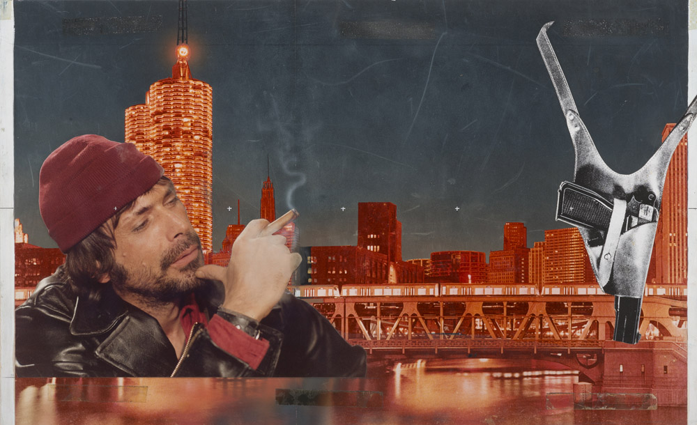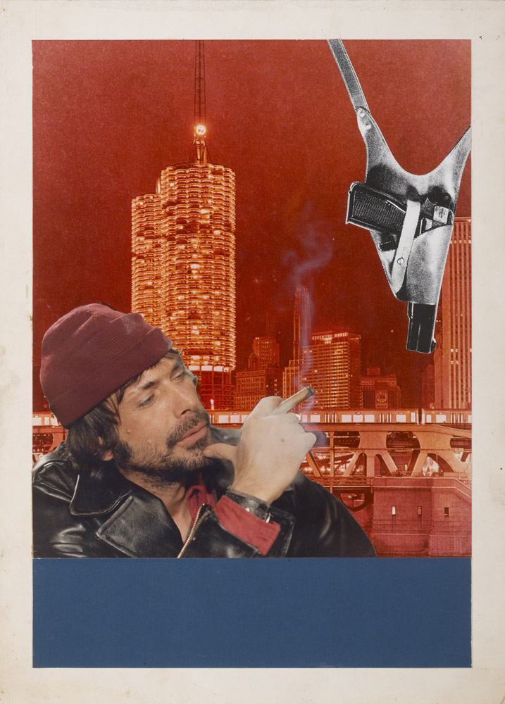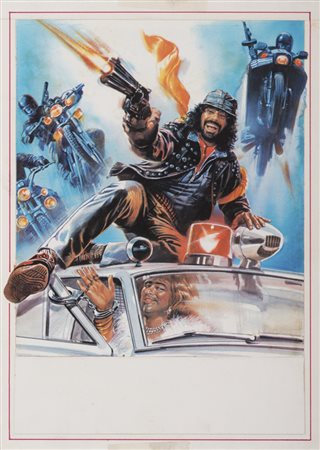 IL GIUSTIZIERE SFIDA LA CITTA' e DELITTO AL BLU GAY Due bozzetti per le locandine del film drammatico del 1975 diretto da Umberto Lenzi e uno del film del 1984 di Bruno Corbucci con Tomas Milian Collage fotografico su stampa su cartoncino, cm. 34 x 25 e cm. 45 x 22,5 Tecnica mista e collage su cartoncino, cm. 33 x 53 PROVENIENZA Collezione Società Adriana Chiesa Enterprises, Roma