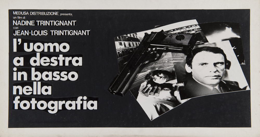 L'UOMO A DESTRA IN BASSO NELLA FOTOGRAFIA Bozzetto per il manifesto del film drammatico del 1973 diretto da Nadine Trintignant, con Juliet Berto e Michel Bouquet. Tecnica mista e collage e intervento a matita sul retro, cm. 34 x 64 PROVENIENZA Collezione Società Adriana Chiesa Enterprises, Roma