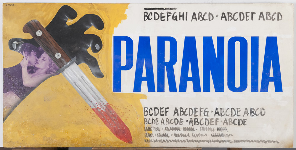 PARANOIA Bozzetto per la locandina del film del 1970 diretto da Umberto Lenzi con Carrol Baker e Jean Sorel Tecnica mista e collage su cartoncino, cm. 33,5 x 67,5 Firmato in basso a sinistra 'Calma' PROVENIENZA Collezione Società Adriana Chiesa Enterprises, Roma