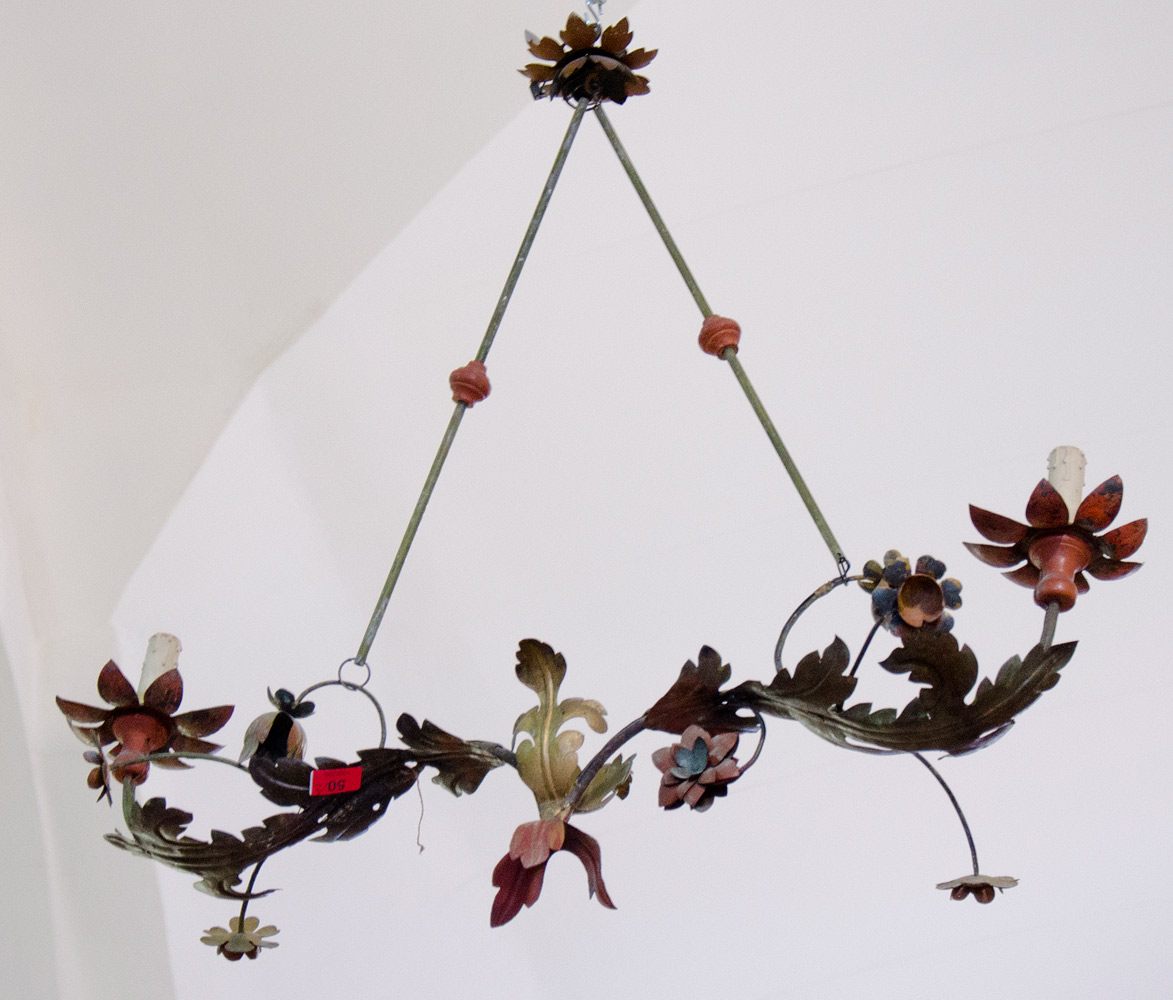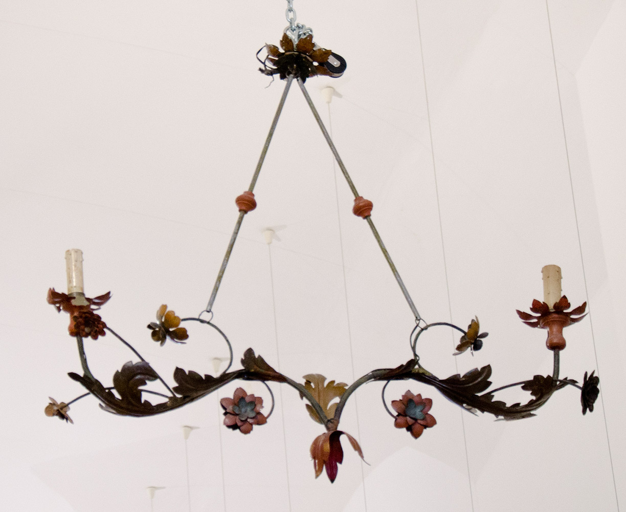 Coppia di lampadari in ferro battuto e dipinto a motivi floreali.