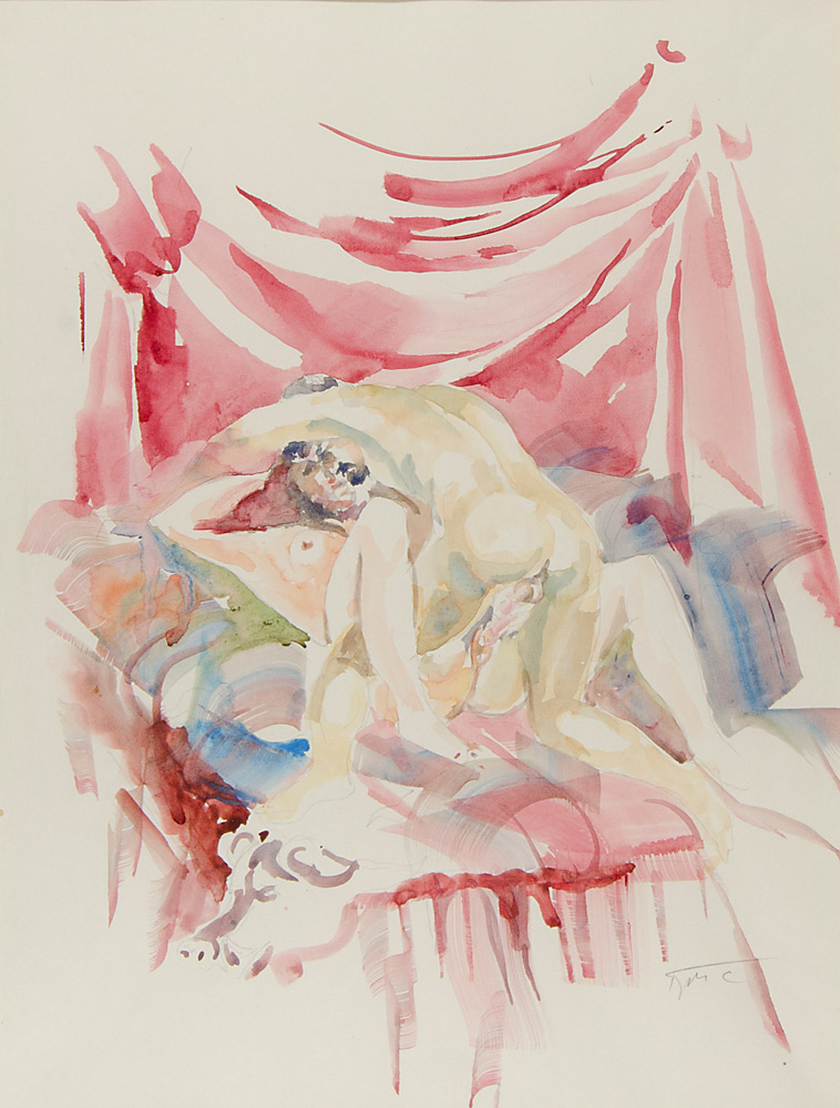 Drago Marin Cherina 1949 "Giochi a letto" cm. 50x37 - acquarello su carta Siglato b. a d.