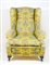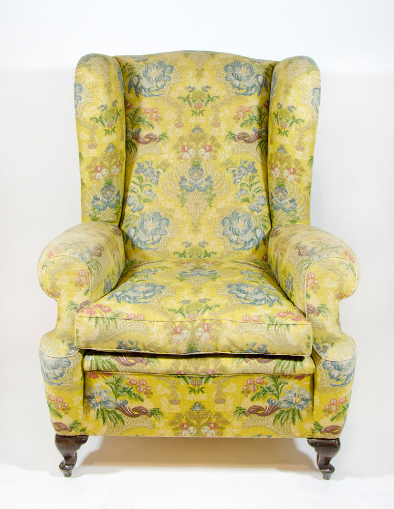 Poltrona ad orecchie rivestita con stoffa floreale.